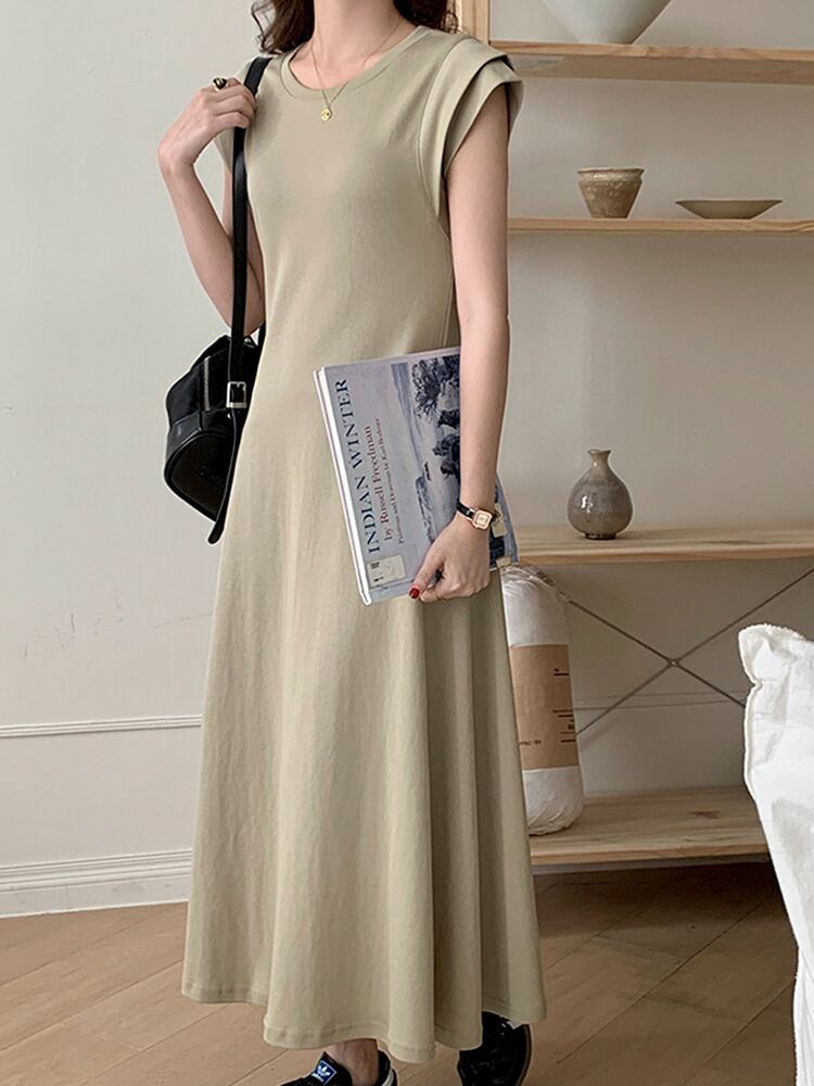 [EWQ] シンプルフライングスリーブドレス O ネックスリムロングドレス夏潮 Vestido 16U1337 サマー 夏物 Oネック