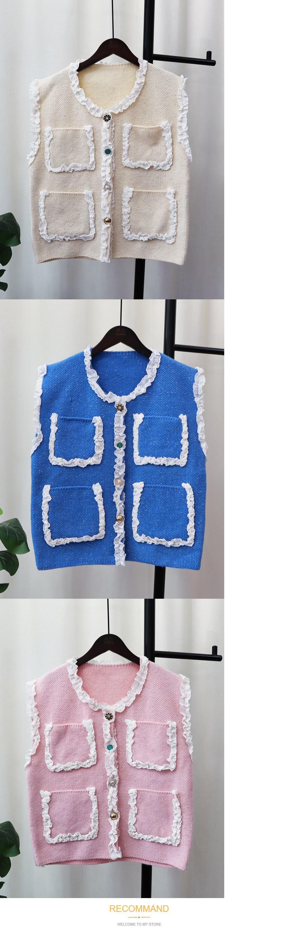 [EWQ] 4 ポケットパッチワークセーターベスト甘いシングルブレストルーズコントラストニットタンクトップ秋 大人ガーリー スウィート キュート カジュアル オータム 秋物