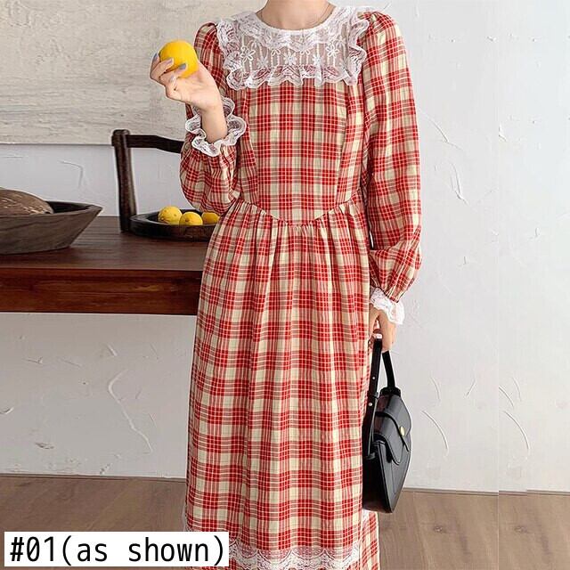 [EWQ] 秋 O ネックパッチワークレースフレアスリーブレトロチェック柄ドレスルーズロングドレス 16O466 オータム 秋物 Oネック