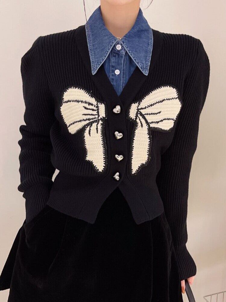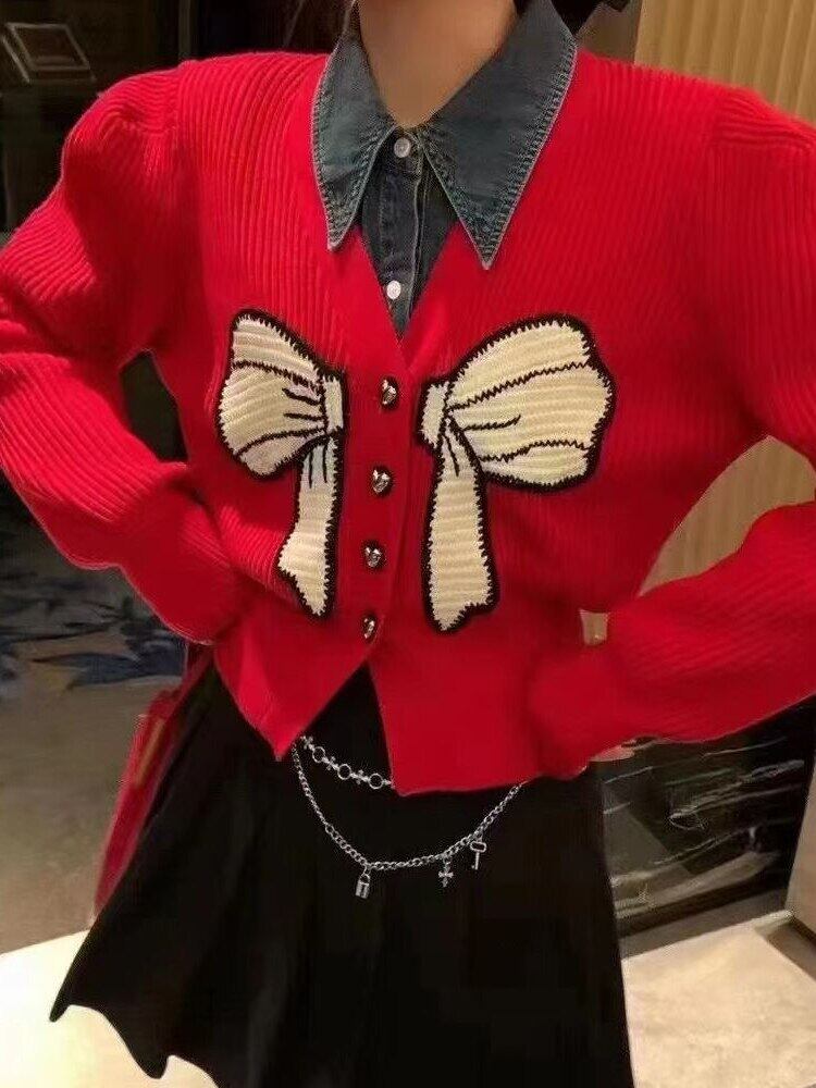 [EWQ] コントラストボウ V ネックカーディガンコート長袖シングルブレストショートセータージャケット秋レッドニットコート ロング リボン オータム 秋物 Vネック