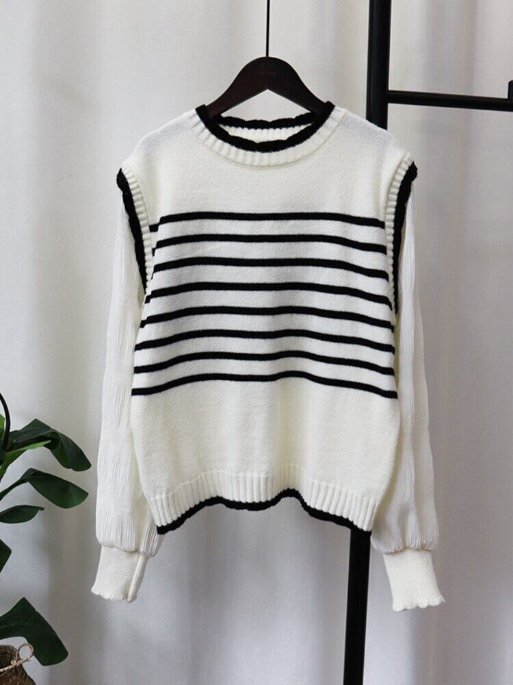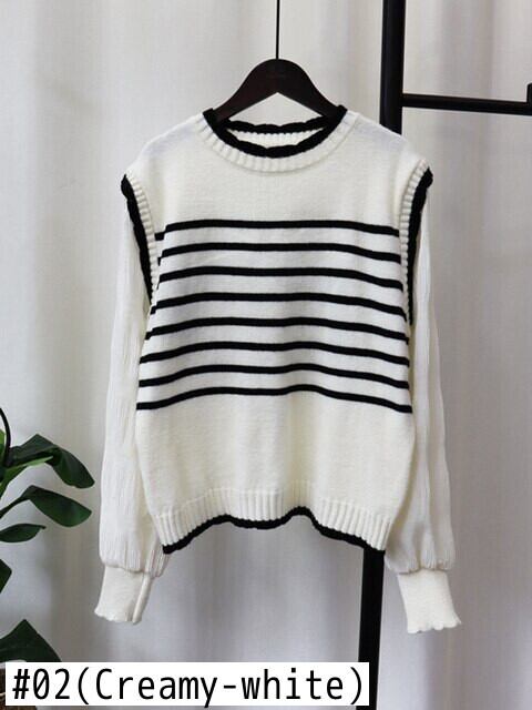 [EWQ] フェイクツーピースパッチワークセーターストライプコントラスト長袖プルオーバーニットトップス秋潮ニットトップス ロング オータム 秋物