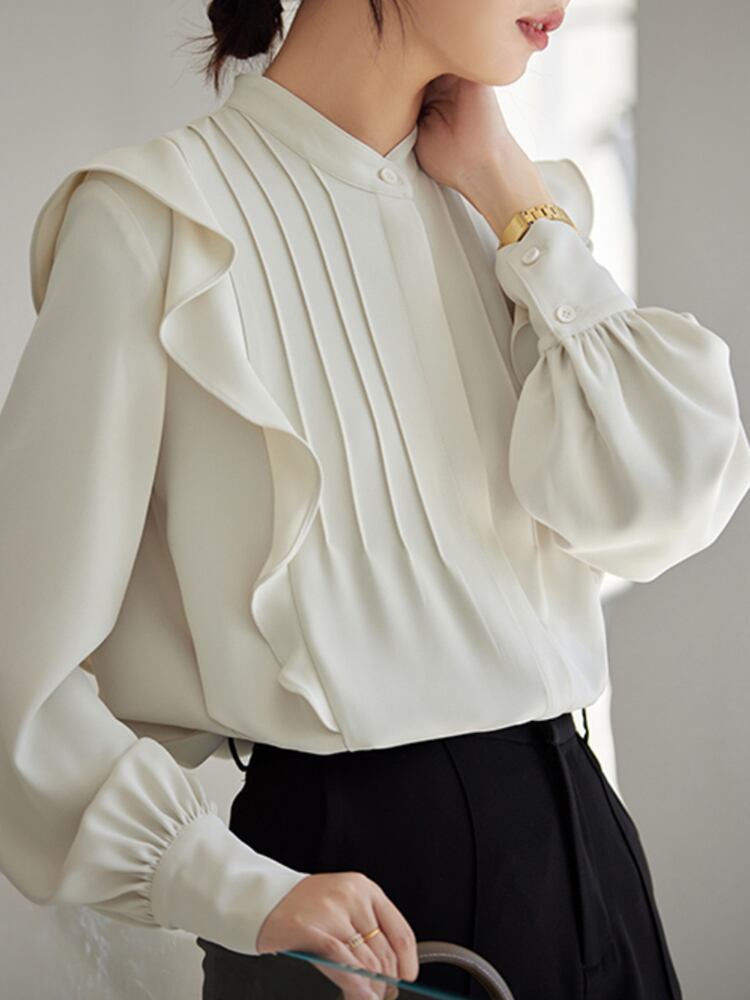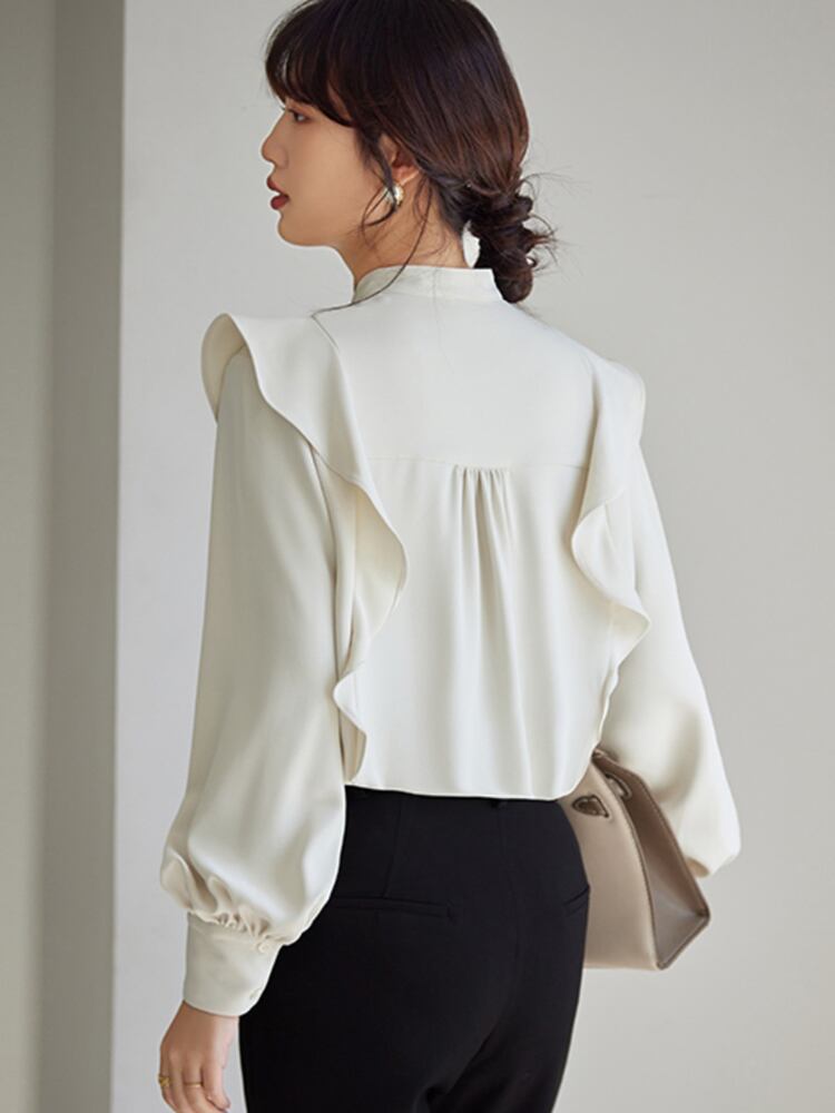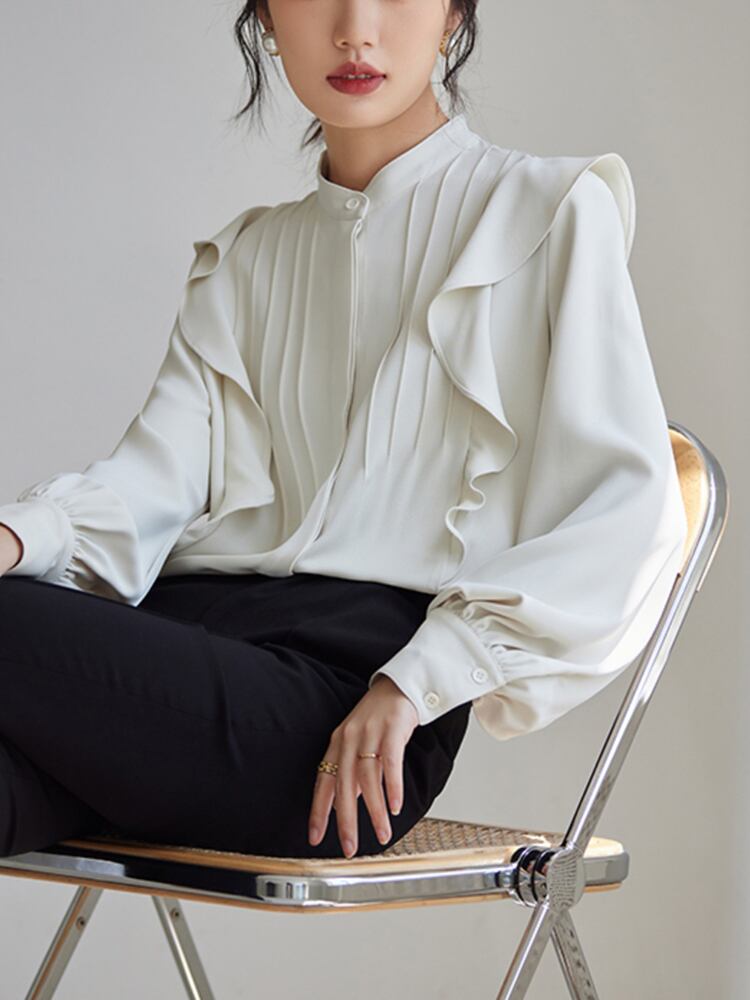 [EWQ] フリルパッチワークプリーツシャツランタンスリーブシングルブレストホワイトブラウス秋潮トップ U333 オータム 秋物