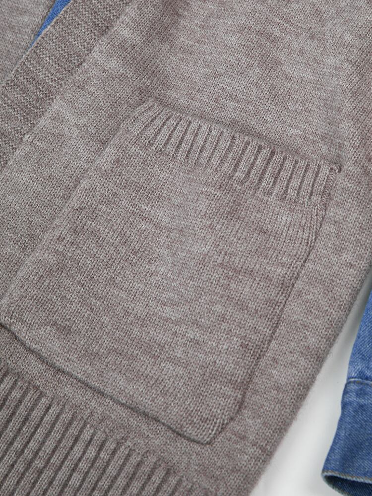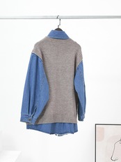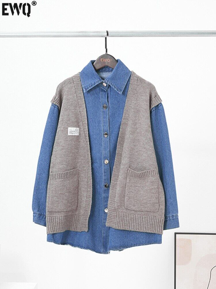 [EWQ] デニムパッチワークカーディガンコートアウター秋潮長袖シングルブレストセータージャケット ロング オータム 秋物