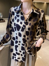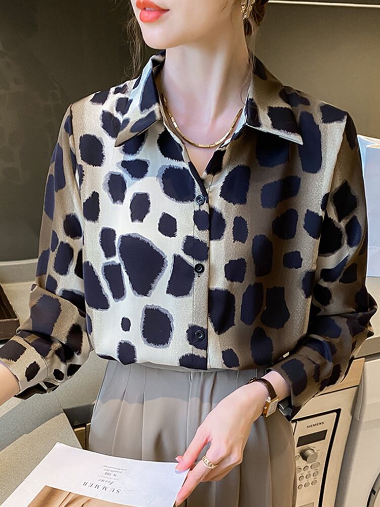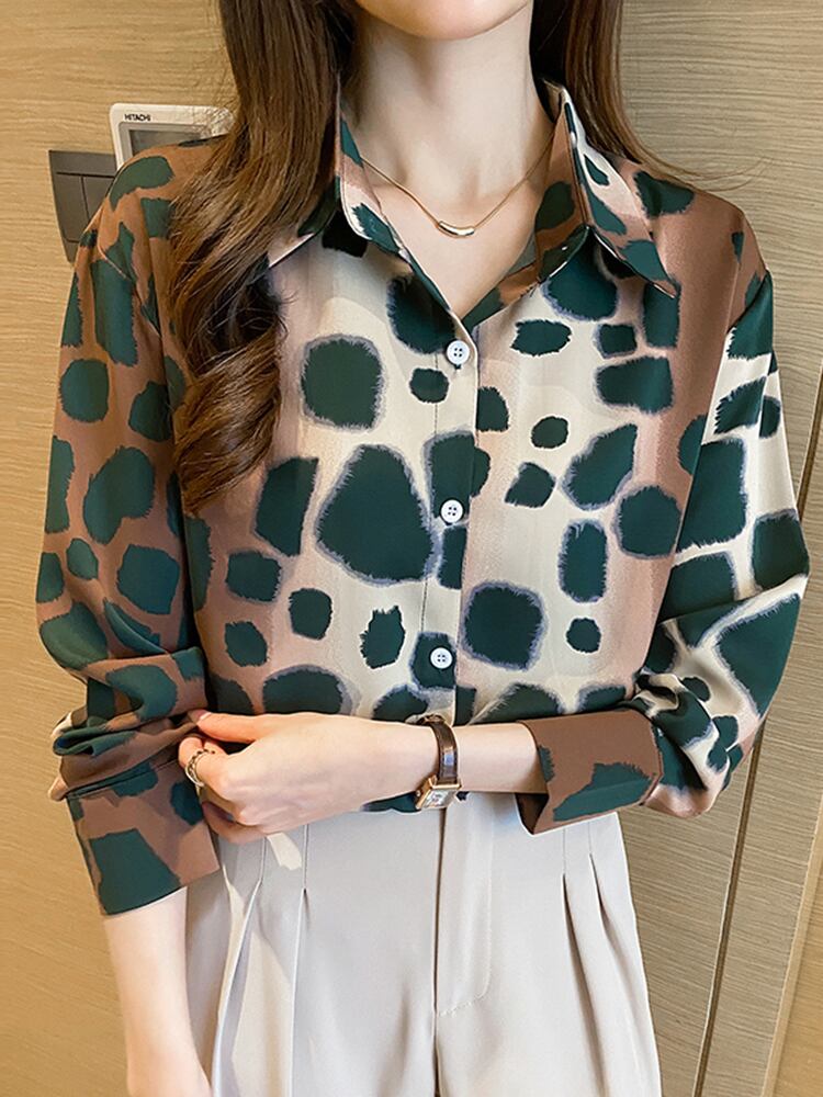 [EWQ] グリーンヒョウ柄ルーズシャツ長袖シングルブレスト秋潮ラペルトップ U3178 ロング オータム 秋物
