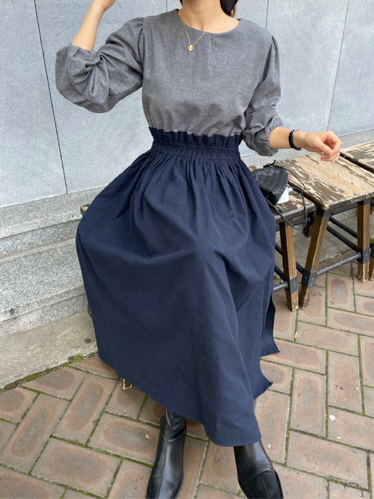 [EWQ] パッチワークコントラストドレス長袖プリーツウエスト弾性ドレス秋潮 Vestido ロング エラスティック 伸縮 オータム 秋物