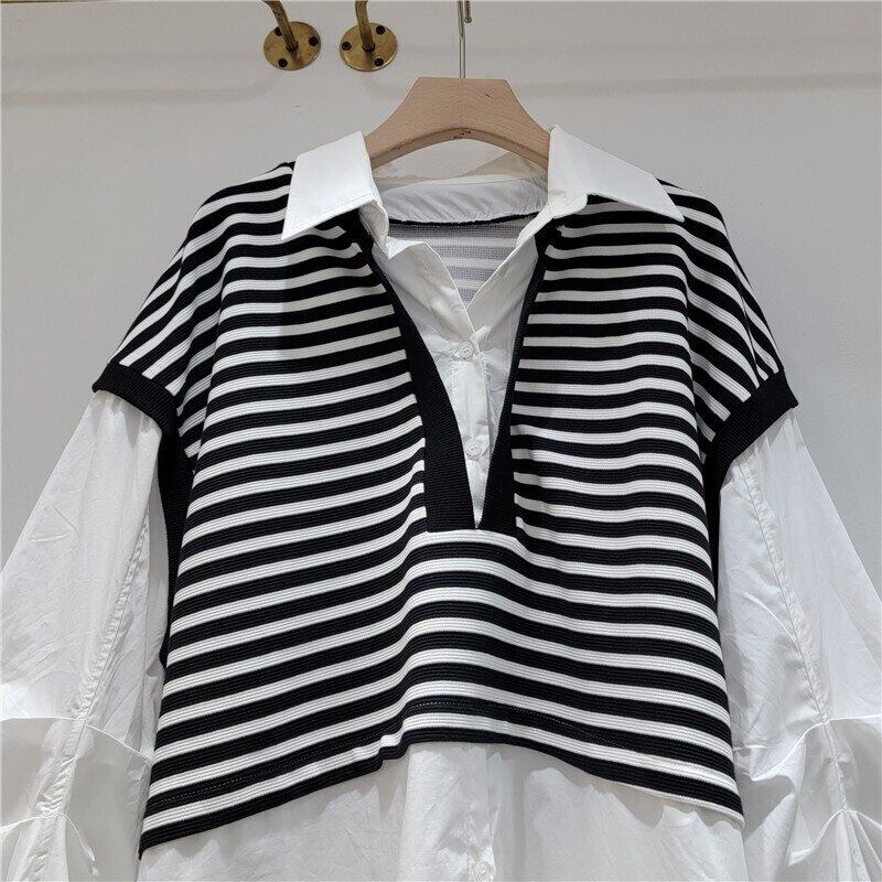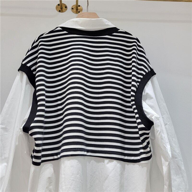 [EWQ] エイブル フェイクツーピースストライプシャツ レディース 長袖 大きいサイズ パッチワーク 秋潮ブラウス ロング オータム 秋物