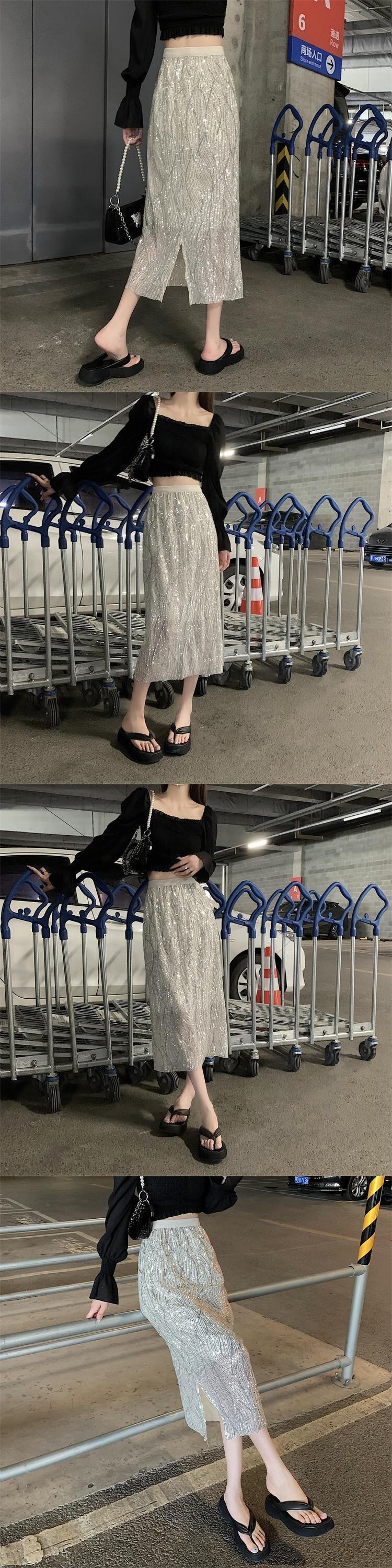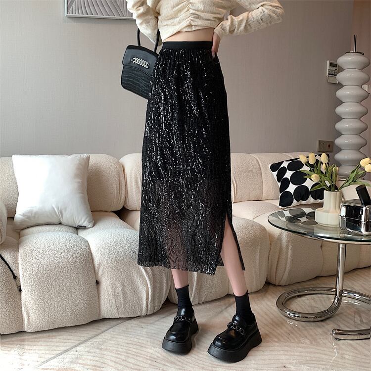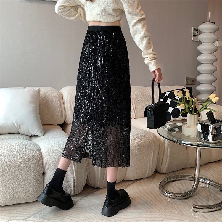 [EWQ] 黒スパンコールレディーススカート有能でトレンディ美しいロングスカート Faldas 秋 ブラック オータム 秋物