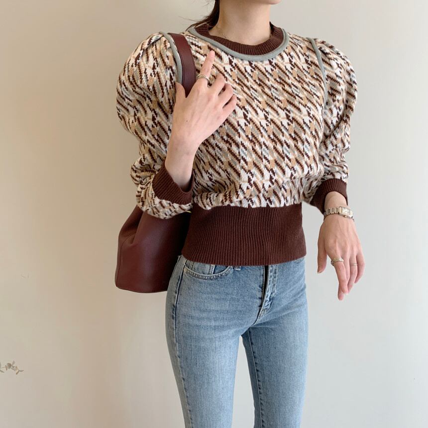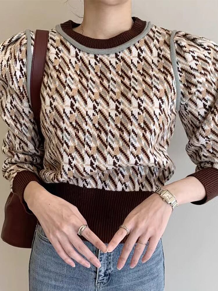 [EWQ] O ネックプリントセーター長袖パッチワークコントラスト O ネックプルオーバーニットジャンパー秋トップ ロング オータム 秋物 Oネック