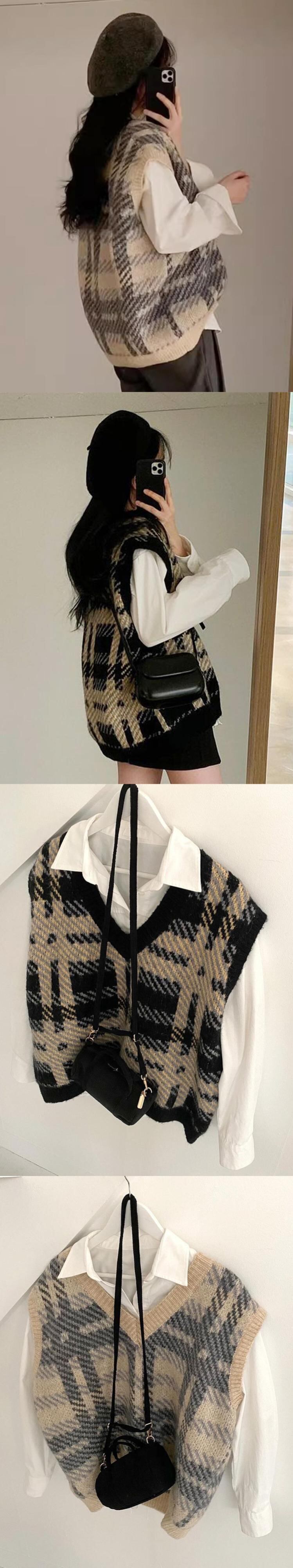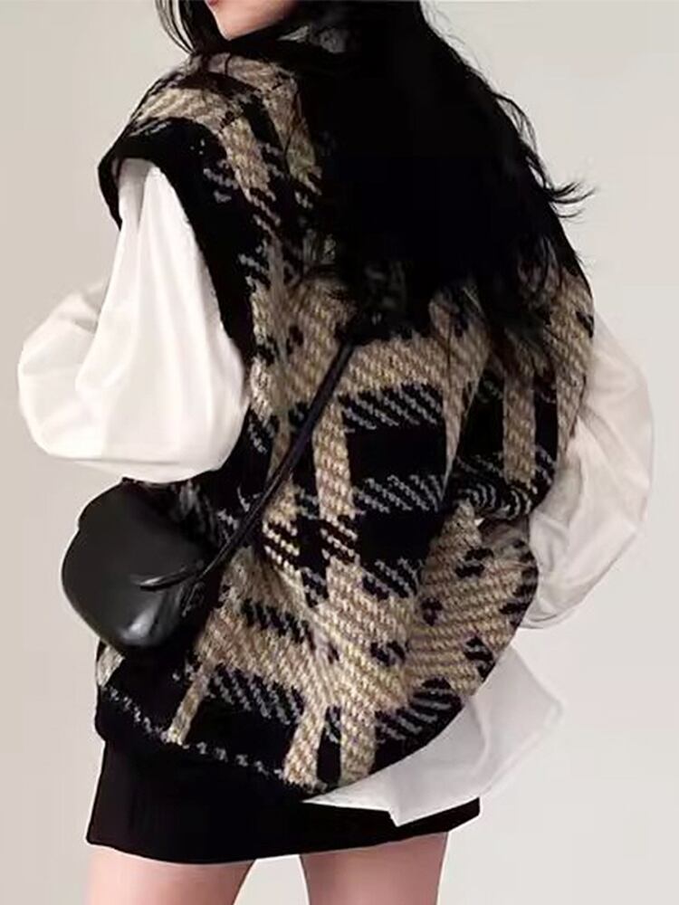 [EWQ] V ネックチェック柄セーターベストコントラストカラールーズニットプルオーバータンク秋潮トップ 609 オータム 秋物 Vネック