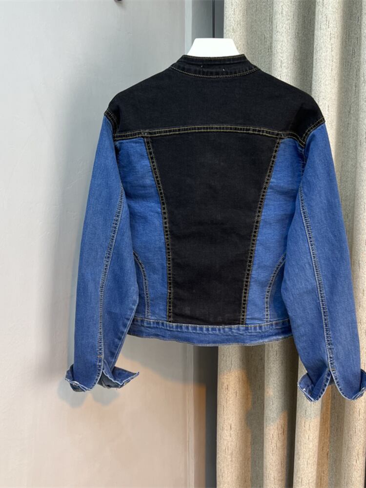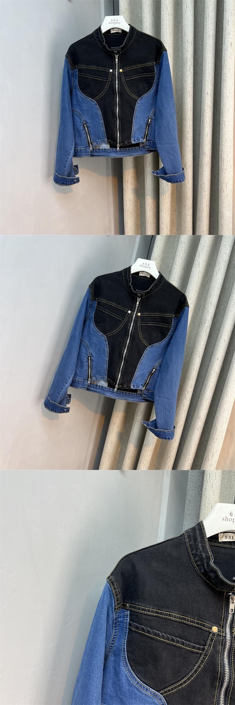 [EWQ] スタンドカラー コントラストカラー パッチワーク デニムジャケット ストリート 長袖 ジップアップ コート 秋 ヨーロピアン ロング オータム 秋物