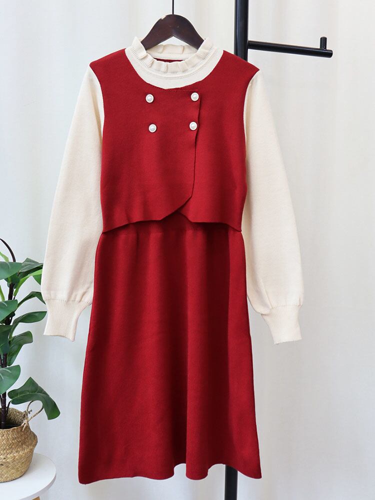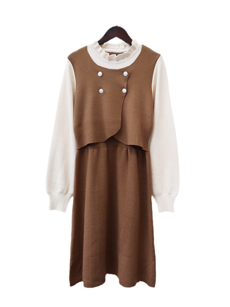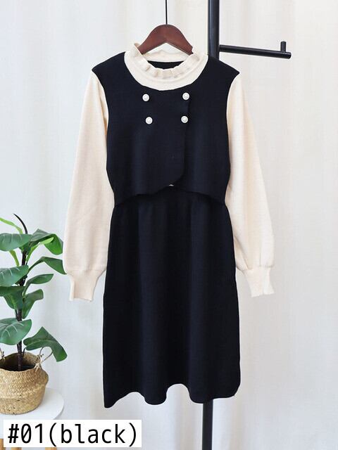 [EWQ] カラーコントラストフリルフェイクツーピースパッチワークルーズセータードレス秋長袖ニットドレス ロング オータム 秋物