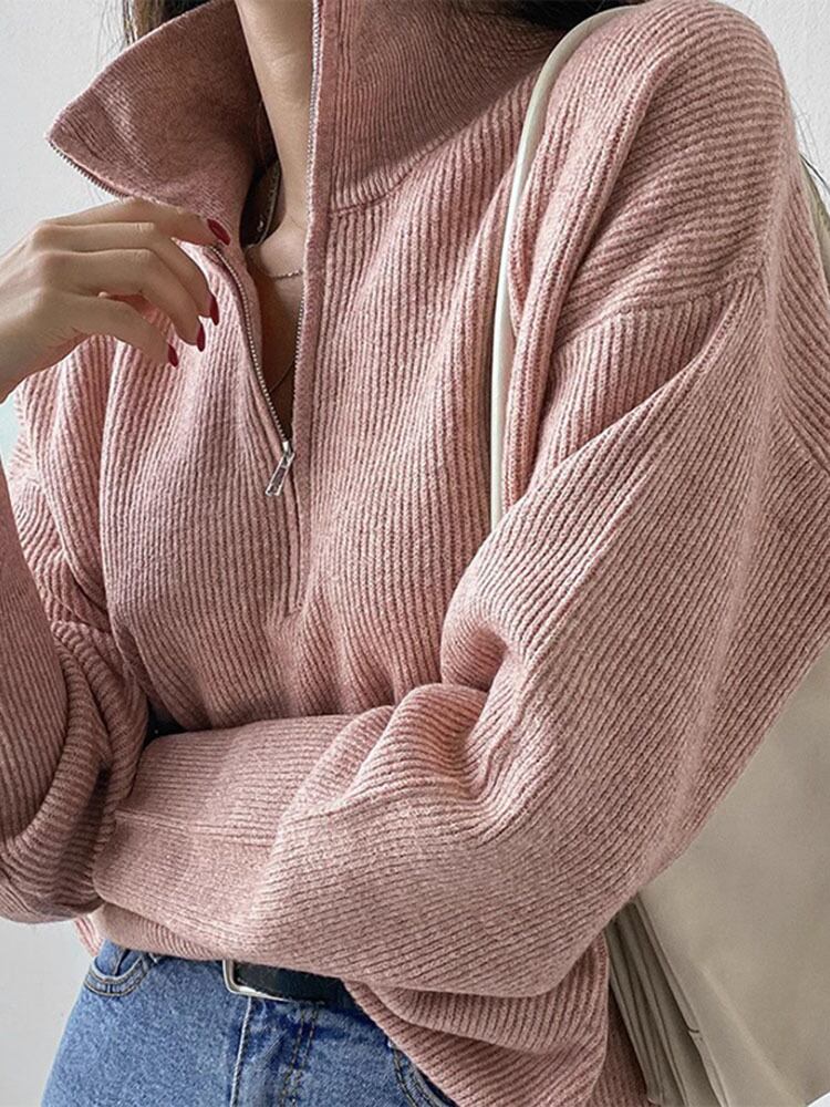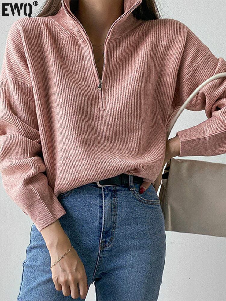 [EWQ] 秋ラペルハーフジップスタイルルーズニットプルオーバー長袖ソリッドカラーセータープルオーバー ロング オータム 秋物