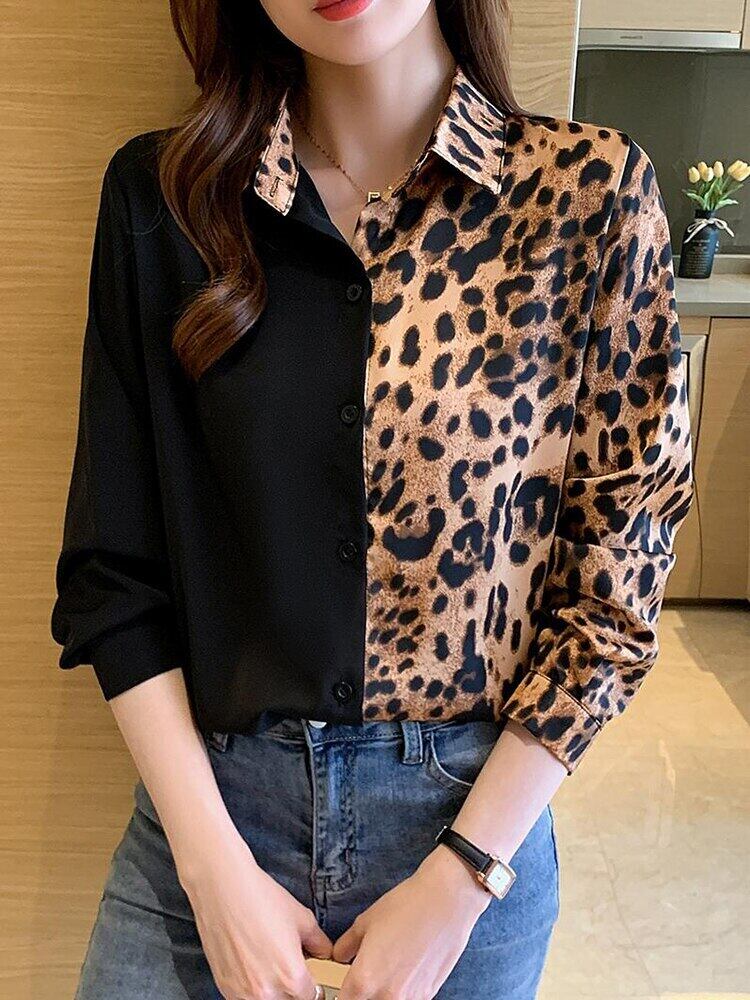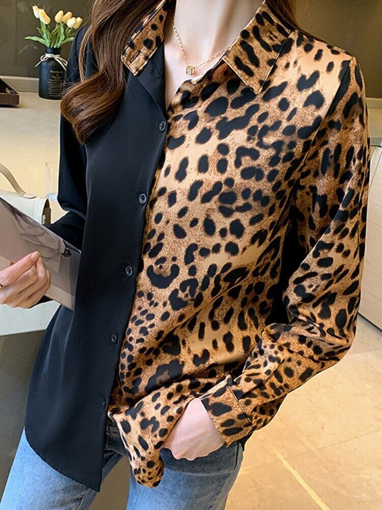[EWQ] ヒョウ柄パッチワークシャツ レディース 長袖 ゆったり 秋 シングルブレスト タイドトップ 16U2386 ロング オータム 秋物