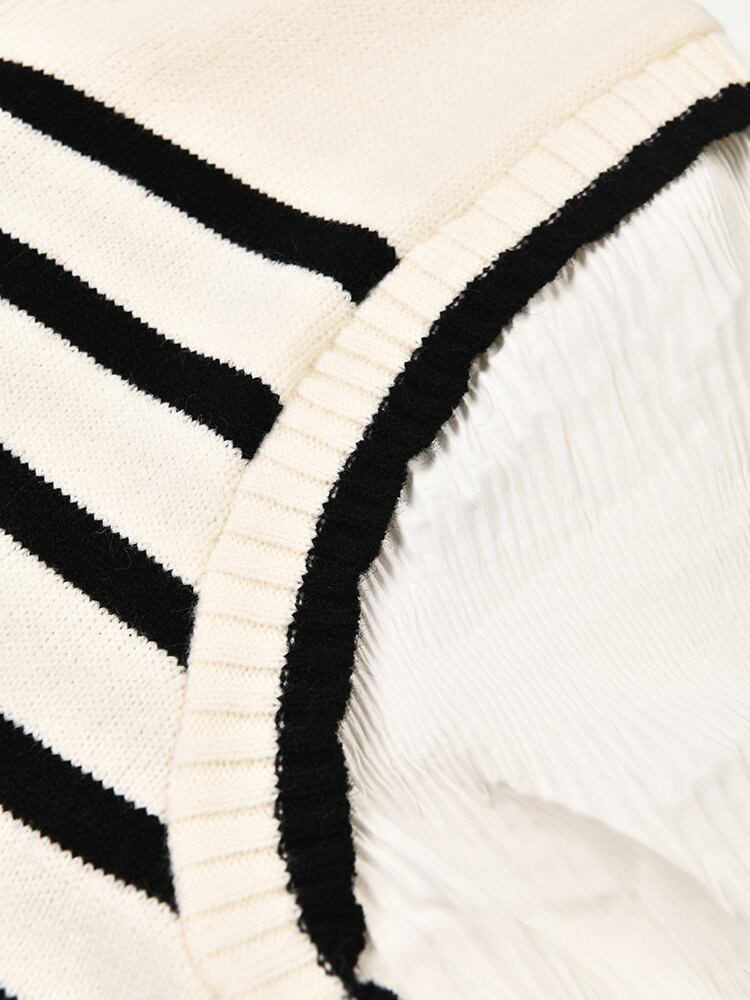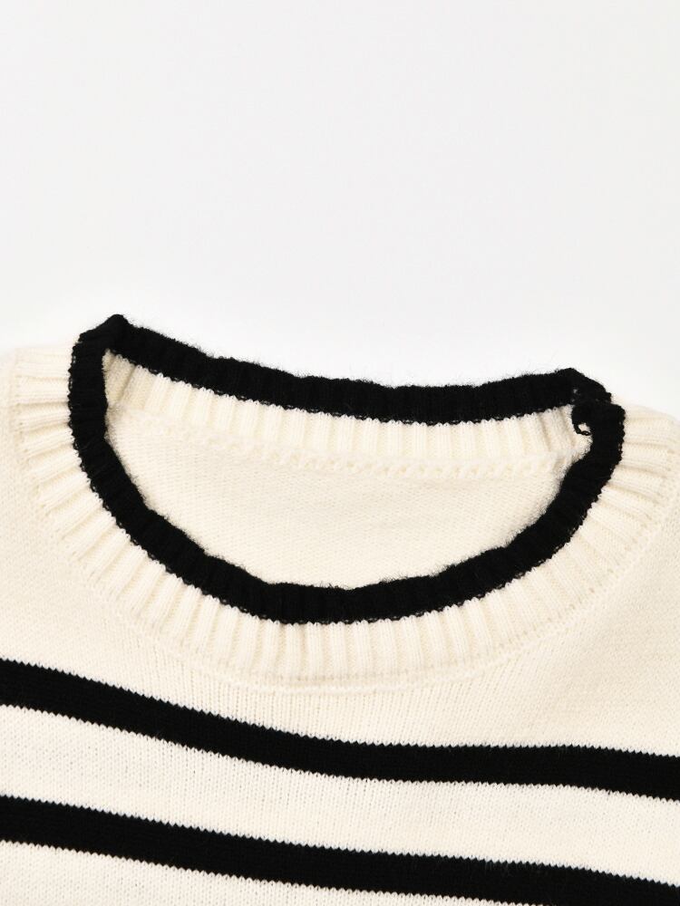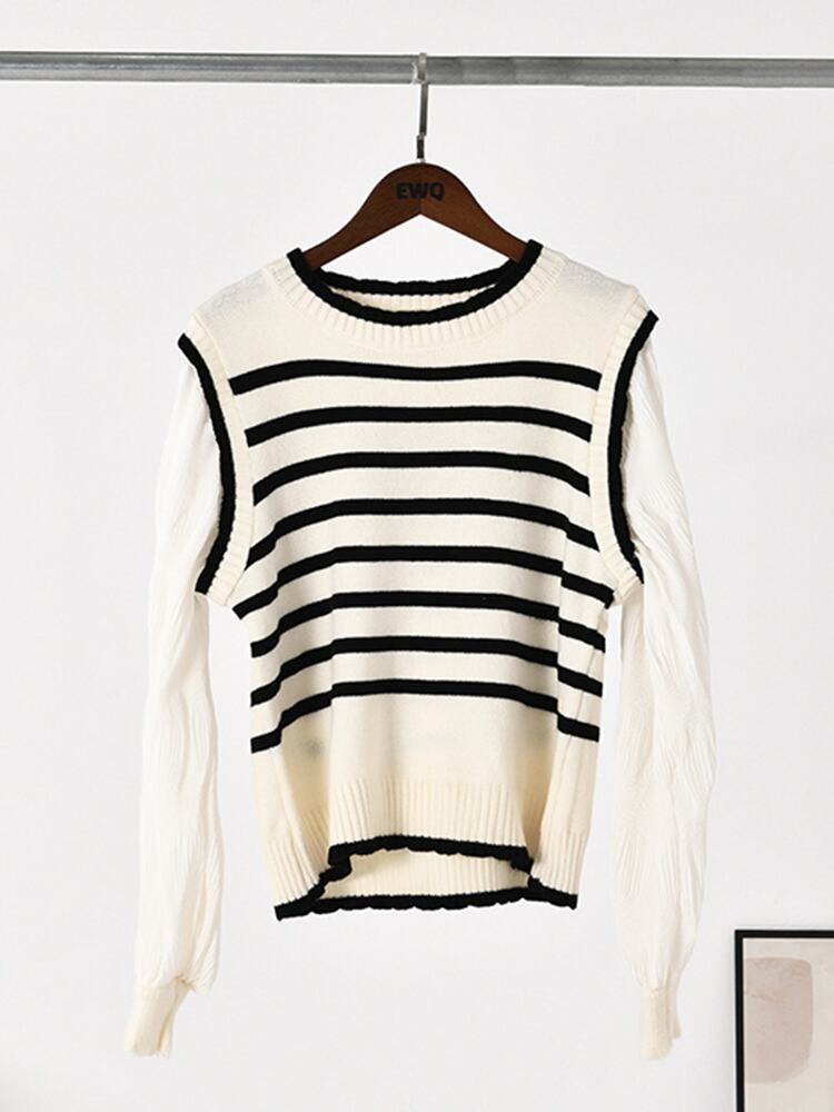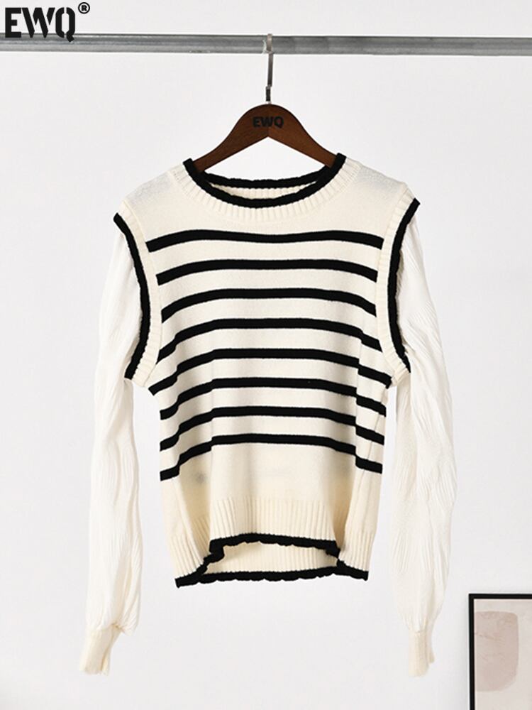 [EWQ] 偽二枚パッチワークストライプセータープルオーバー O ネック長袖ニットプルオーバートップス秋 ロング オータム 秋物 Oネック