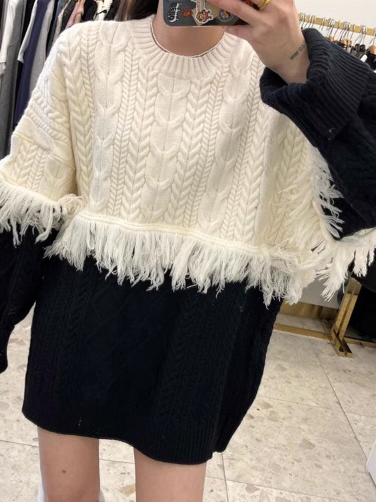 [EWQ] O ネックフェイクツーピースパッチワークカラーコントラストテルルーズセータープルオーバー秋ニットトップス オータム 秋物 Oネック