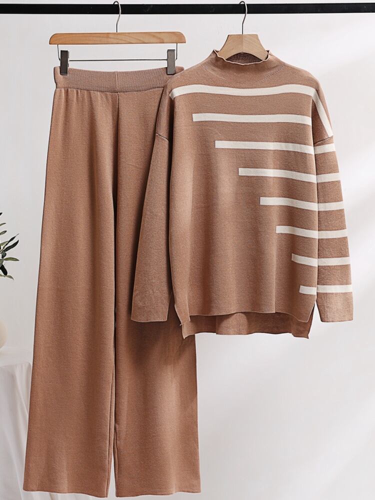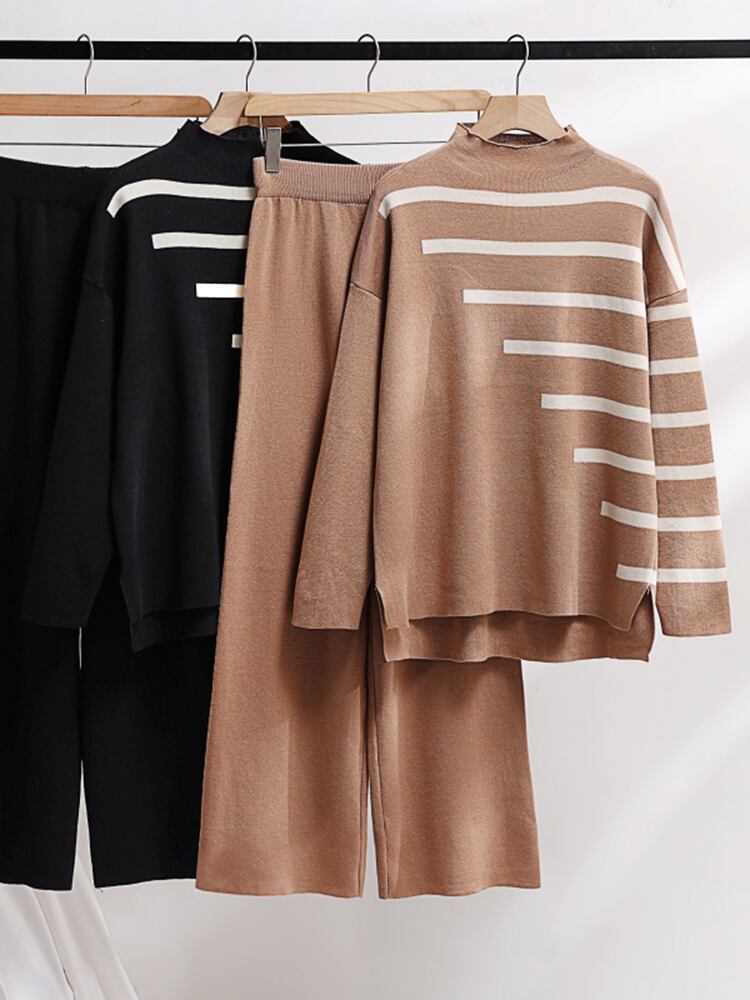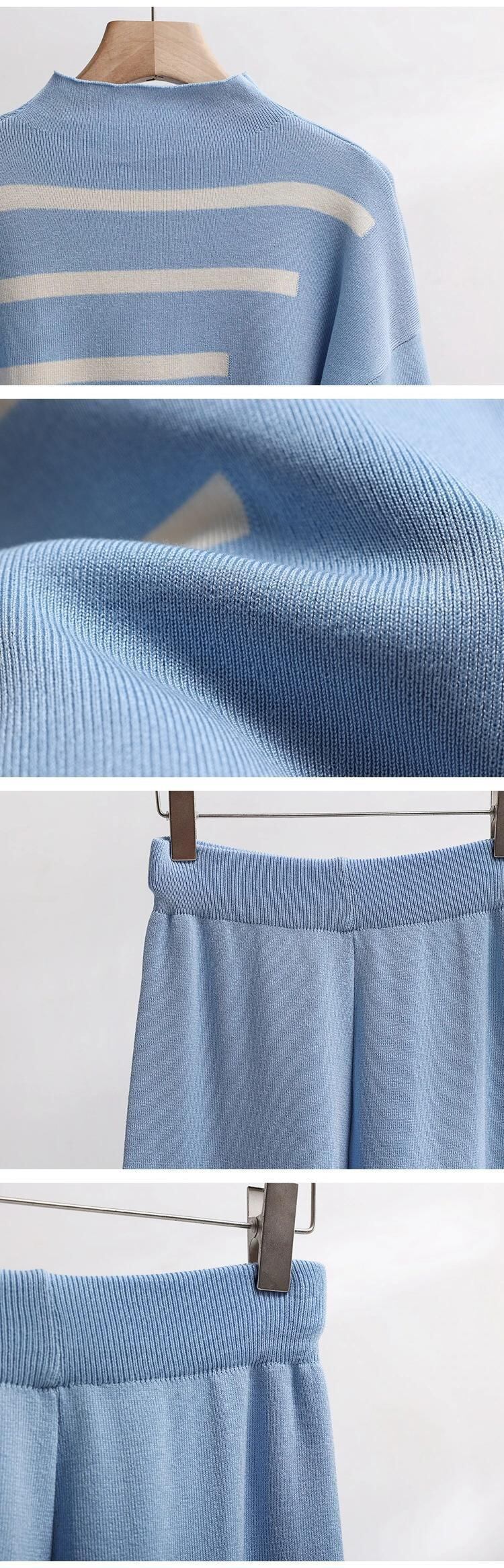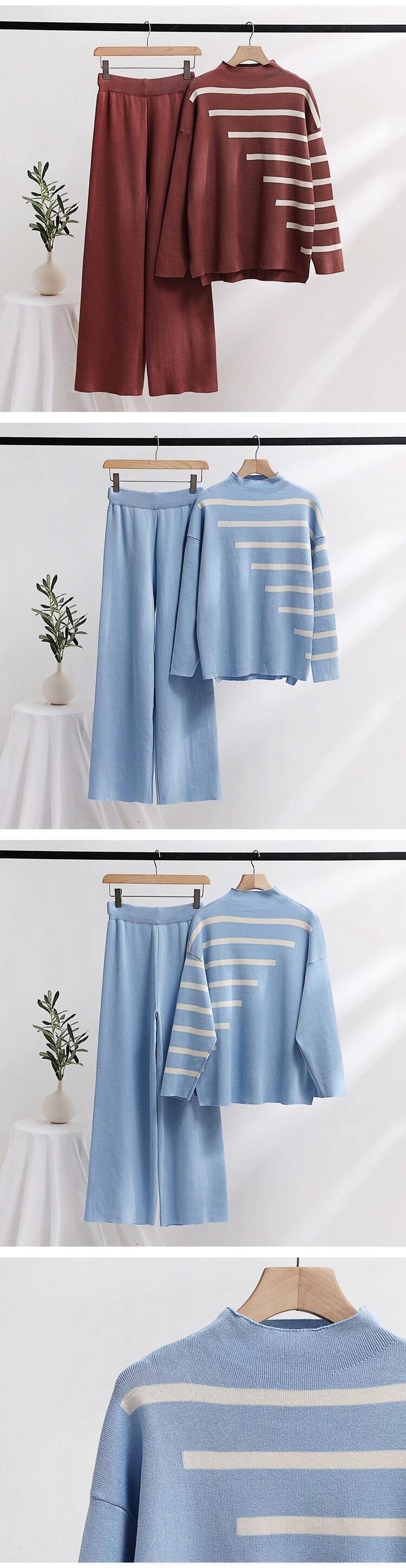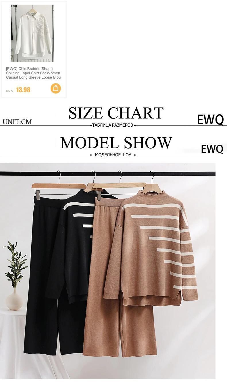 [EWQ] ニットツーピーススーツストライプコントラストセーター + ウエスト弾性ニットパンツ秋潮セット エラスティック 伸縮 オータム 秋物