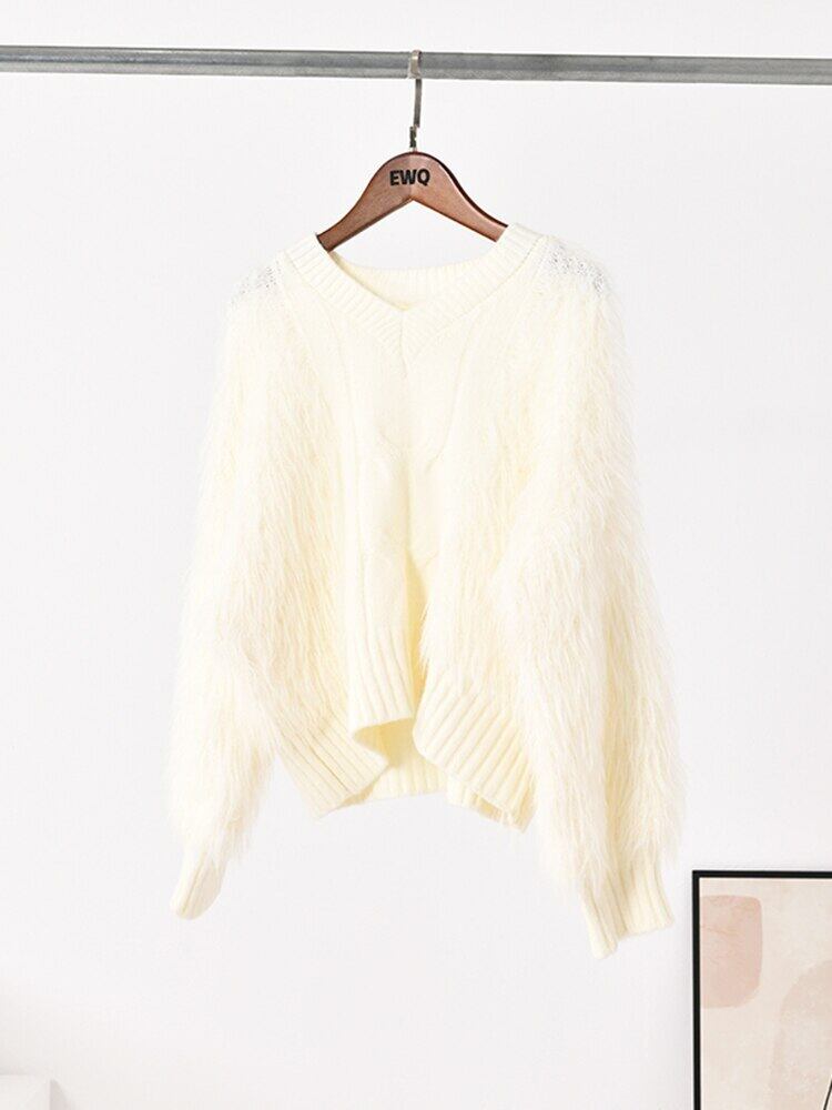 [EWQ] V ネックミンクベルベットニットプルオーバー秋シンプル長袖ソリッドカラーセータープルオーバー ロング オータム 秋物 Vネック