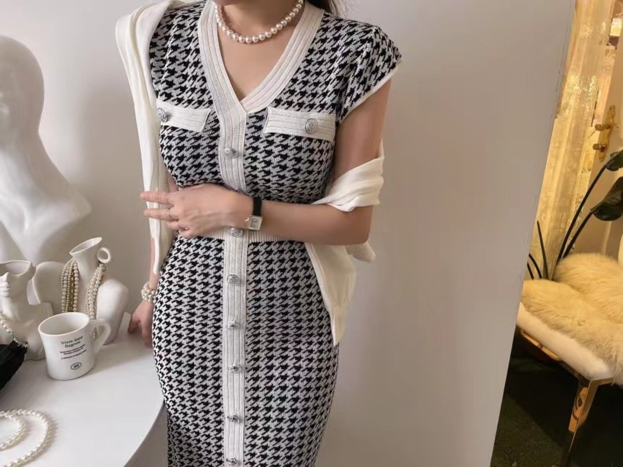 [EWQ] チェック柄コントラストニットドレスボタン装飾半袖ニットドレスサマータイドローブ ショート ハーフスリーブ 夏物