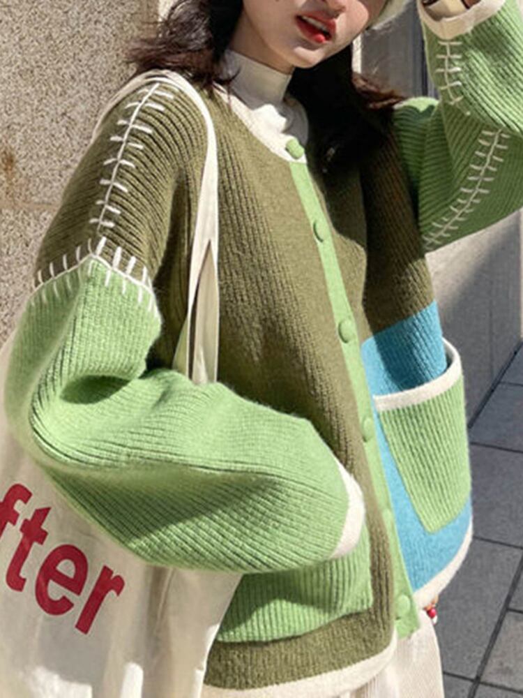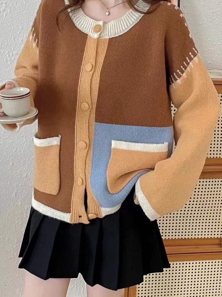 [EWQ] ライン装飾パッチワークカーディガンコートシングルブレストポケットスプライシングセータージャケット秋潮 オータム 秋物