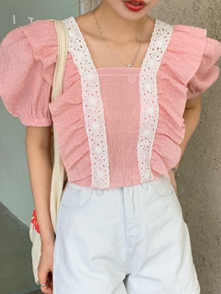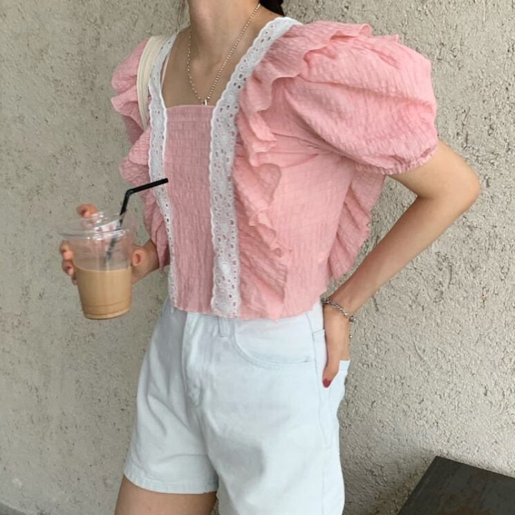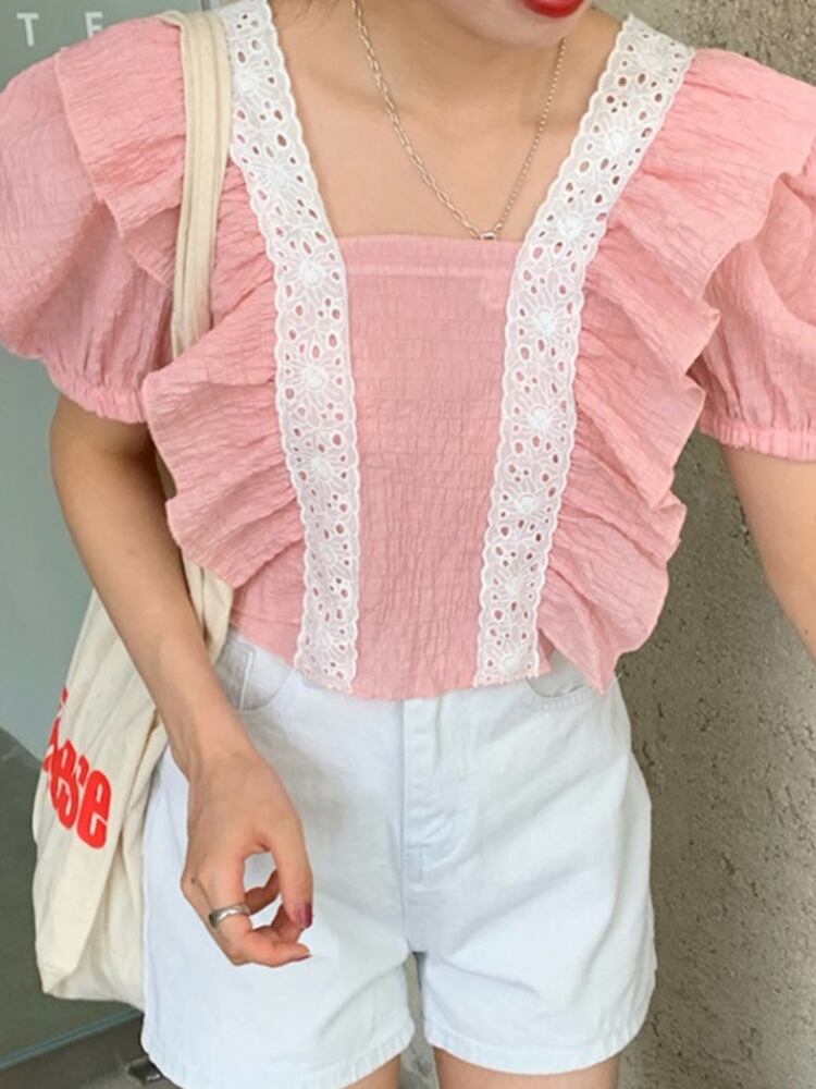 [EWQ] 甘いフックフラワーパッチワークシャツスクエアネックフリルスプライシング半袖ファッション blusas 夏新潮トップス ショート ハーフスリーブ 大人ガーリー スウィート キュート カジュアル サマー 夏物 フラワーデザイン スクウェア
