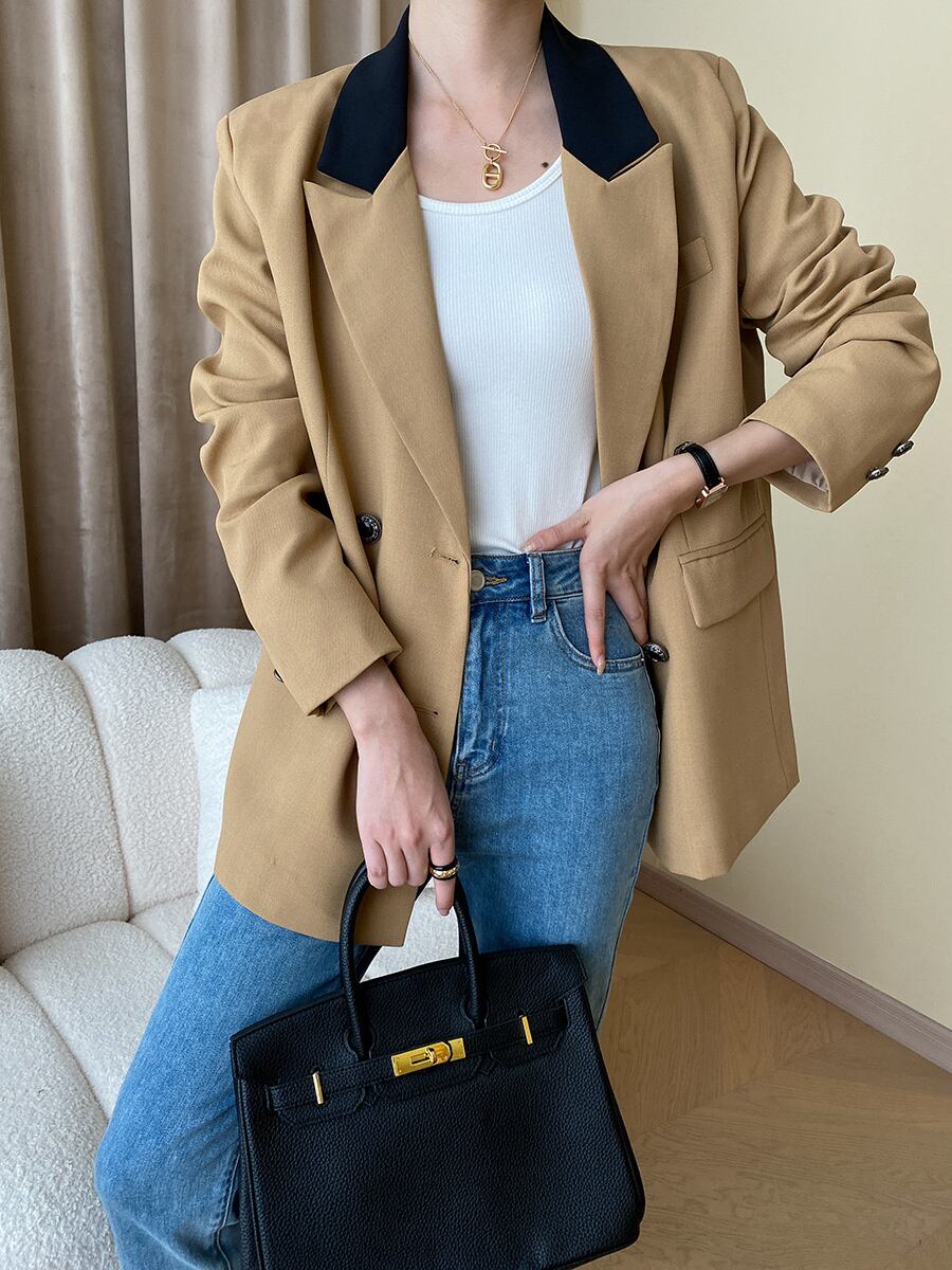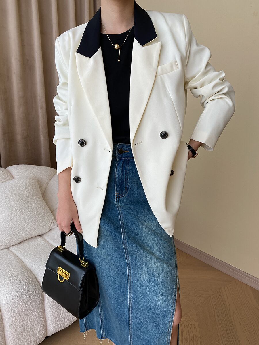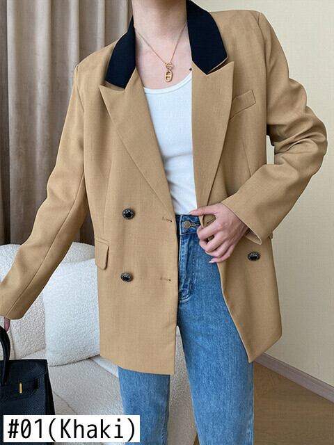 [EWQ] ラペルコントラストカラーブレザーコート長袖ダブルブレストルーズスーツジャケット秋ブレザー ロング オータム 秋物