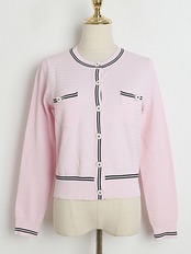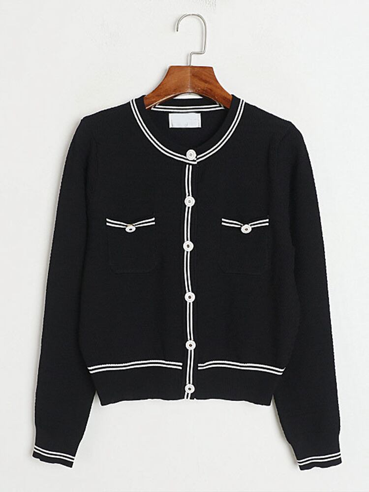 [EWQ] ストライプ O ネックコントラストカーディガンコート長袖シングルブレストパッチワークセータージャケット秋薄いニットトップ ロング オータム 秋物 Oネック