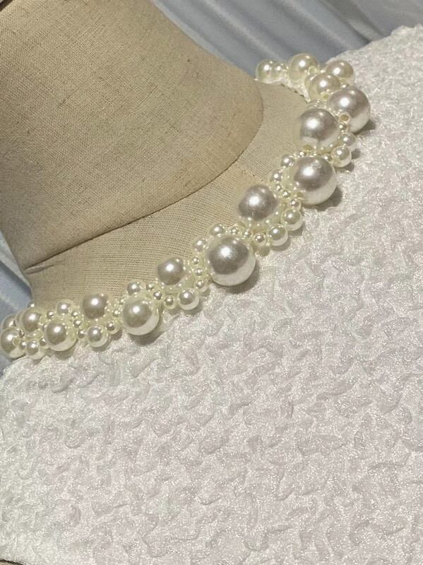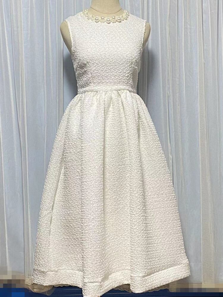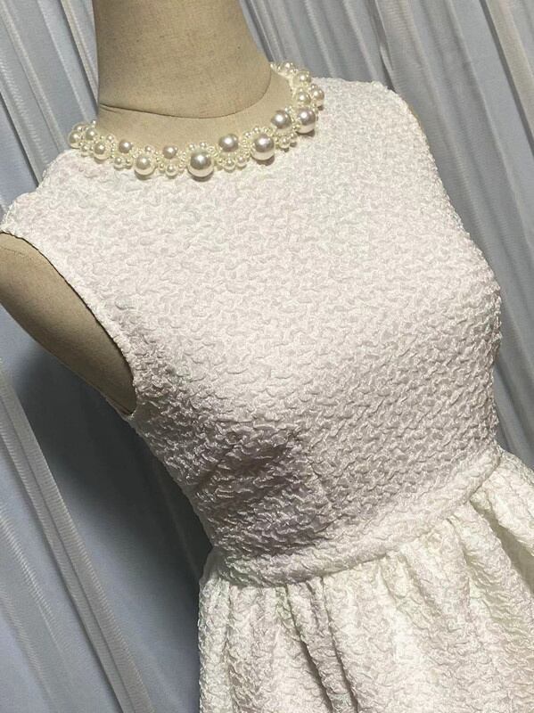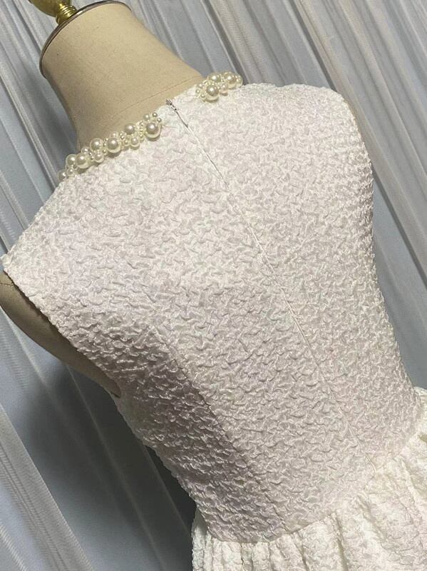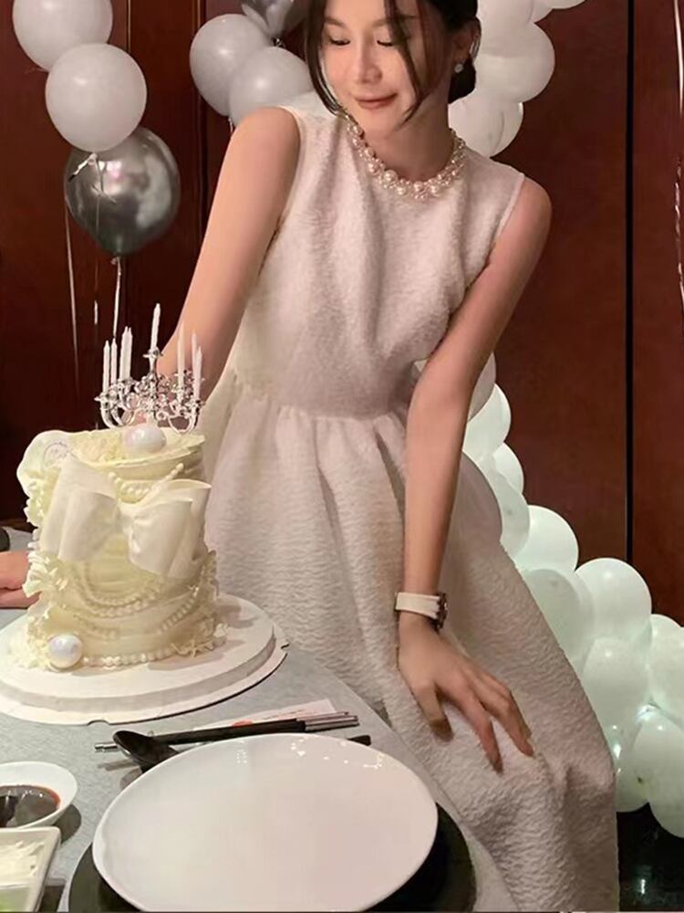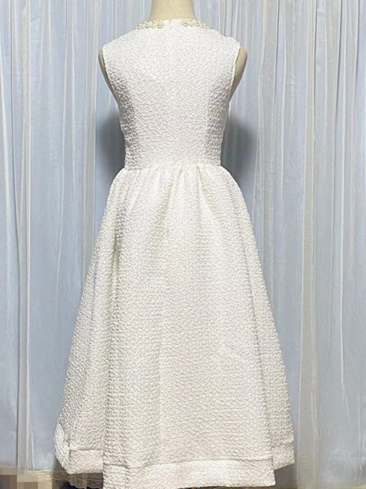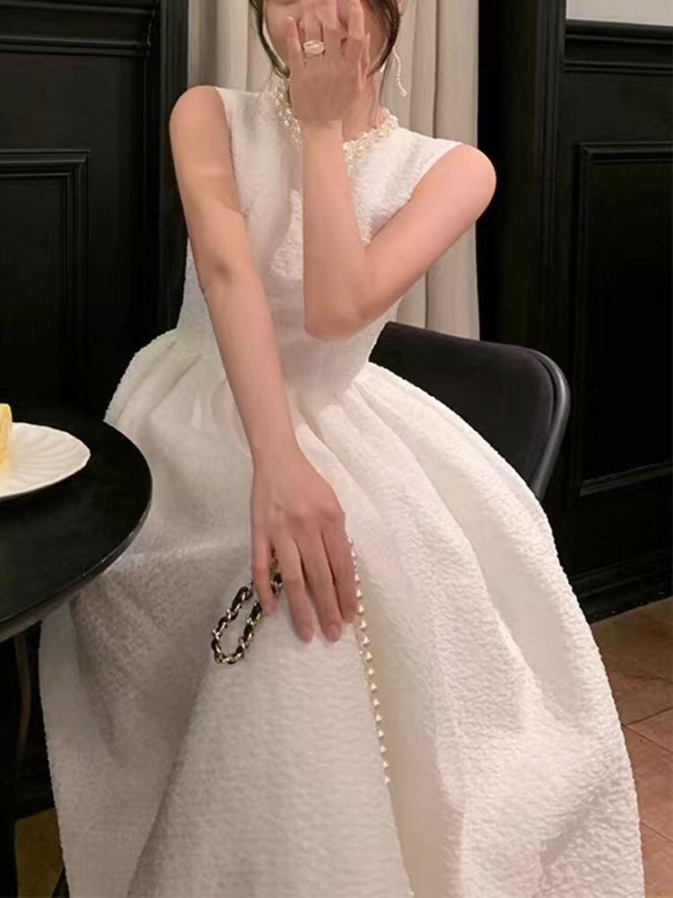 [EWQ] O ネックパール装飾ドレスノースリーブプリーツウエストスリムドレス夏潮パーティー Vestido サマー 夏物 Oネック 真珠