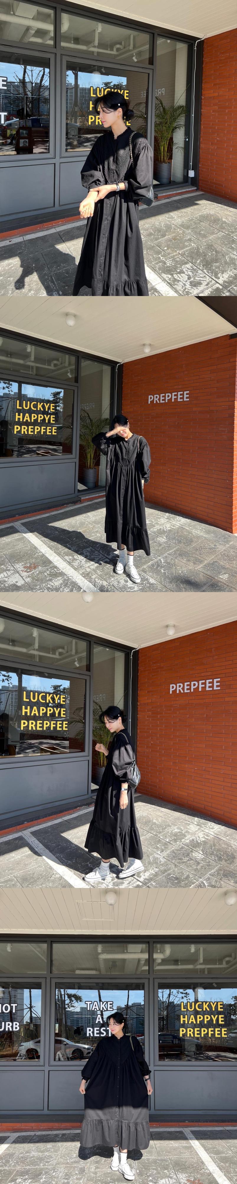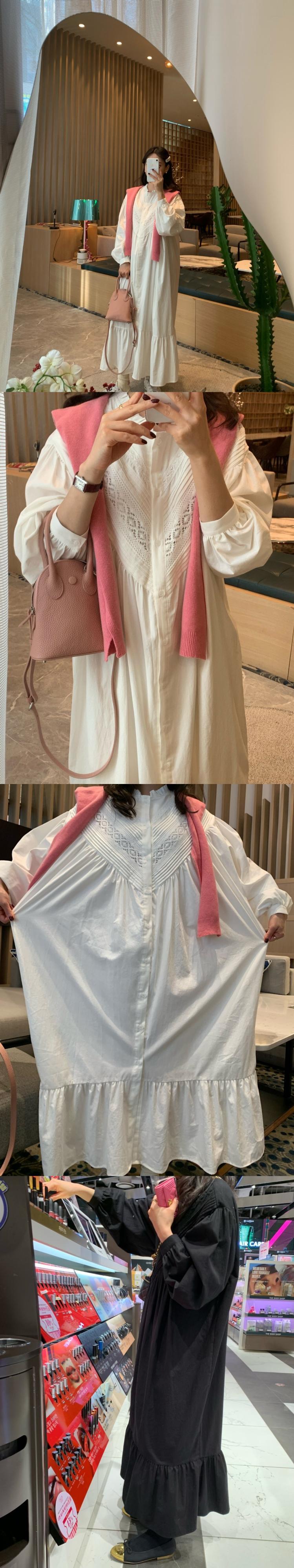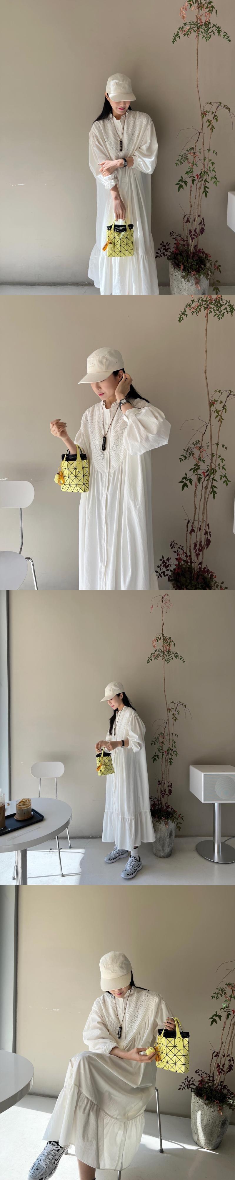 [EWQ] スタンドネック白ドレスランタンスリーブフックフラワールーズシングルブレストドレス秋潮 Vestido 571 ホワイト オータム 秋物 フラワーデザイン