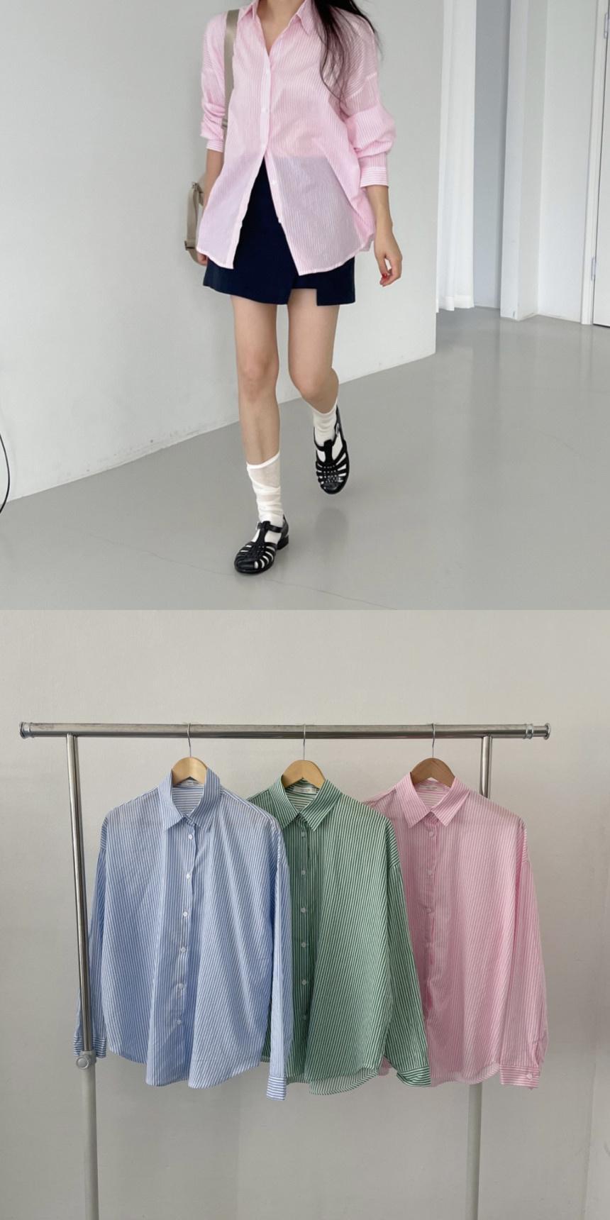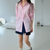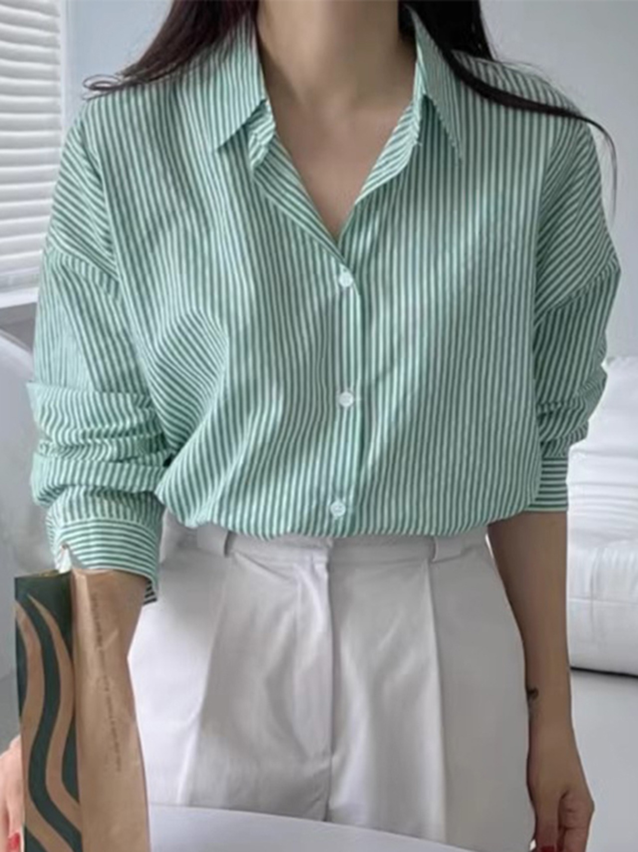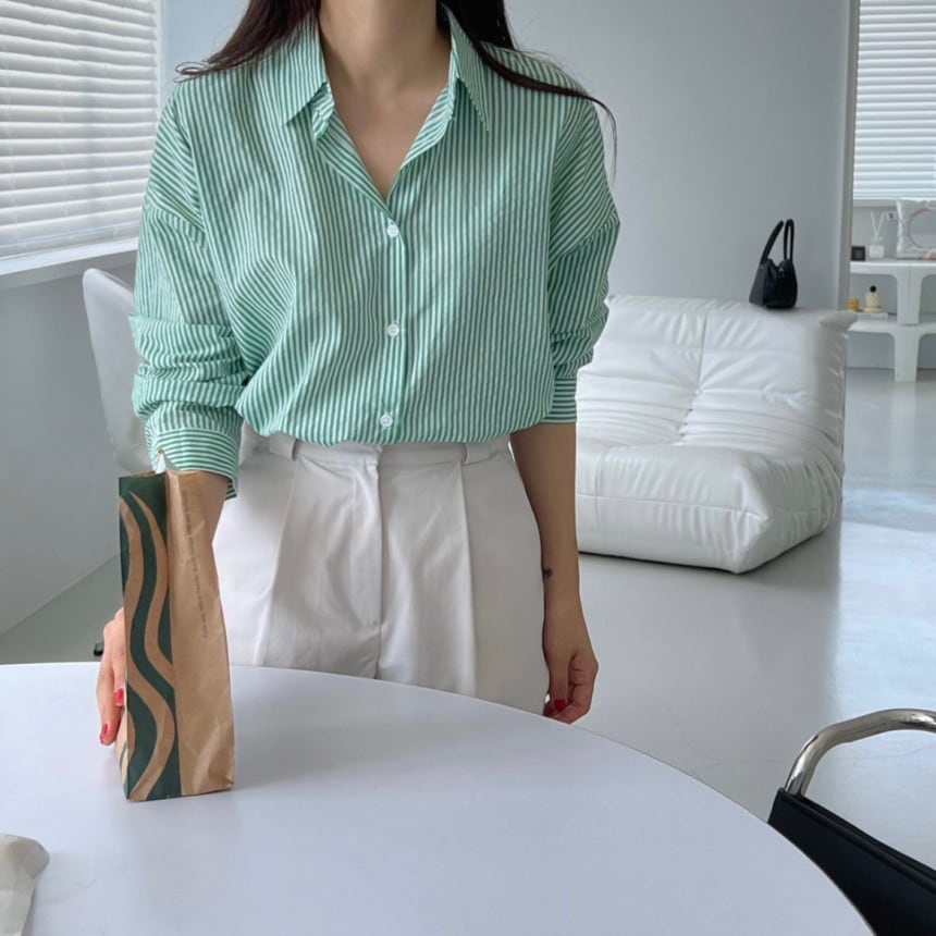 [EWQ] シックストライプラペル長袖シャツシングルブレスト薄手ブラウス秋トップス 16O371 ロング オータム 秋物