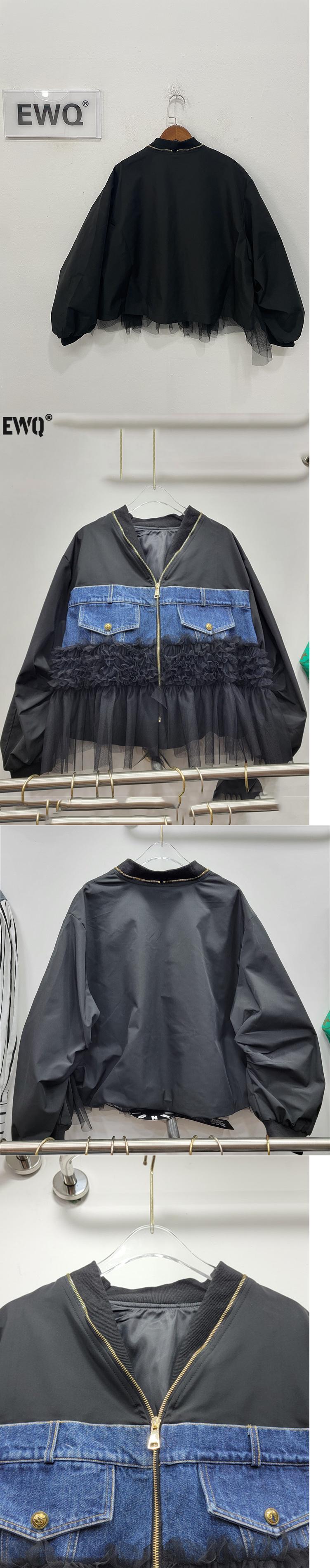 [EWQ] 裾メッシュスプライシングデニムパッチワークジャケット長袖ルーズジップアップジャケットコート秋冬 16U3964 ロング オータム 秋物 ウィンター 冬物