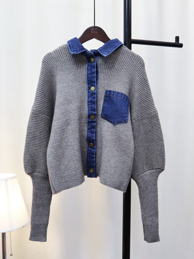 [EWQ] スプライスデニムコート 秋冬 ターンダウンカラー シングル 長袖 セーター カーディガン ニット ジャケット ロング オータム 秋物 ウィンター 冬物