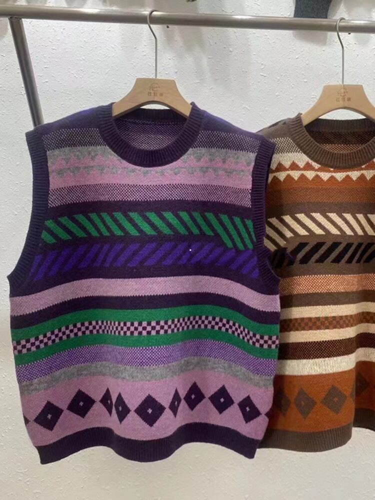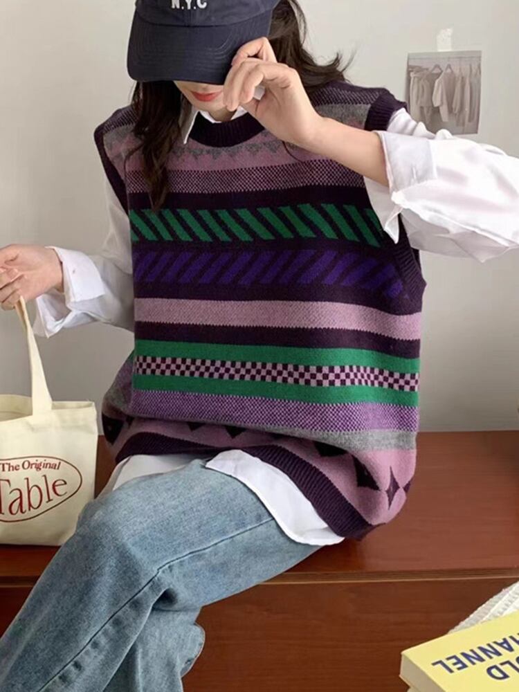 [EWQ] コントラストセーターベストストライプカラフルノースリーブニットプルオーバータンク秋潮トップ 3255 オータム 秋物