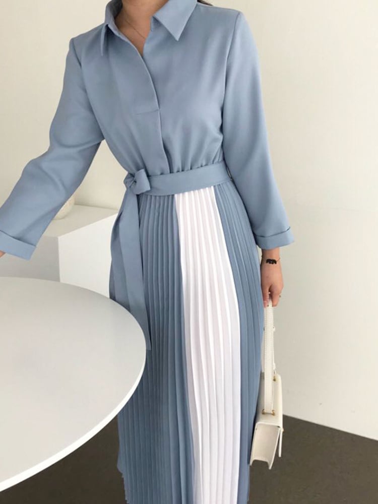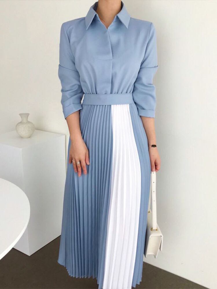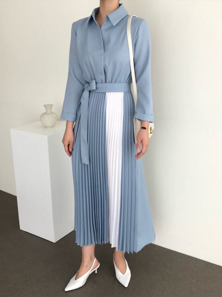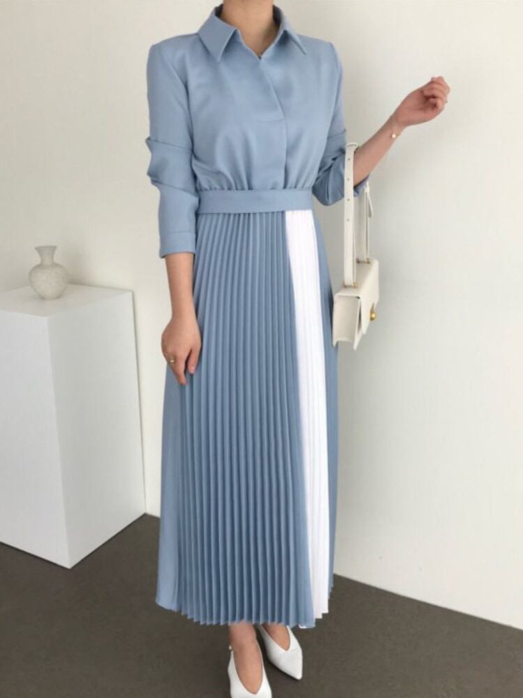 [EWQ] 秋ルーズウエストスリムだった薄いウエストパネルカラーひだマキシドレスローブ オータム 秋物