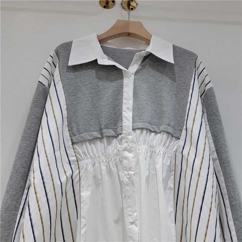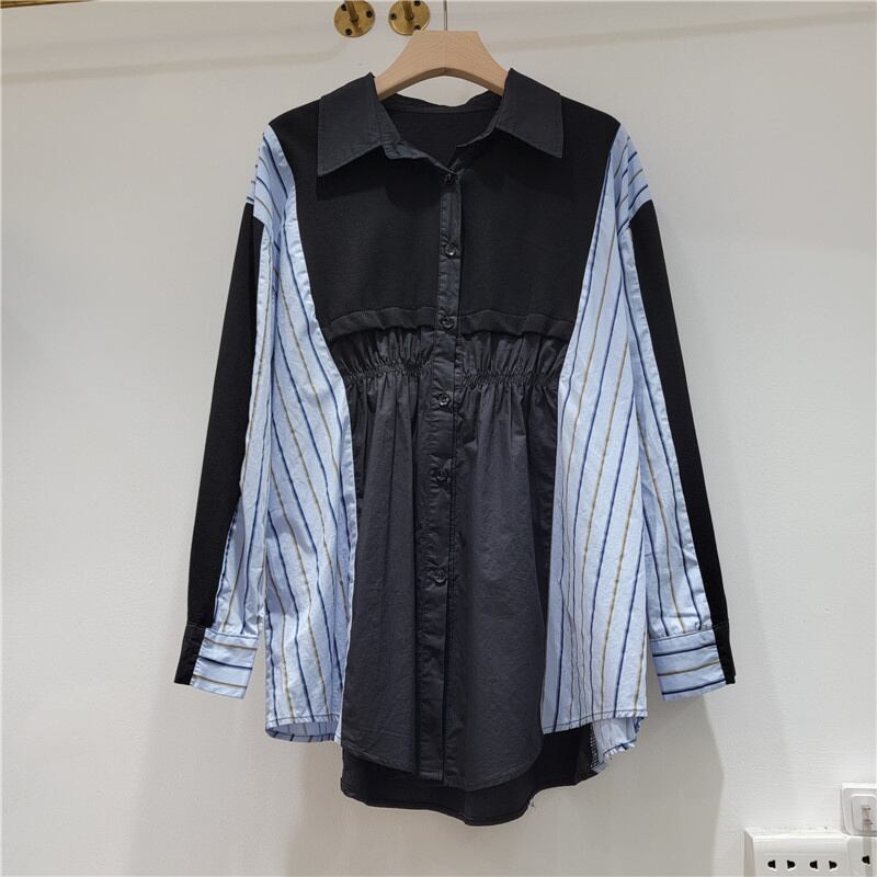 [EWQ] ストライプ コントラスト パッチワーク シャツ ルーズ 長袖 プリーツ 伸縮性裾 不規則秋潮トップ ロング エラスティック オータム 秋物