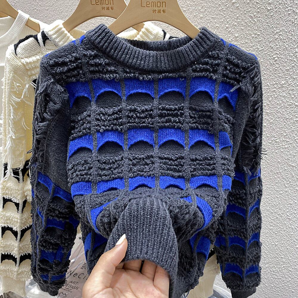 [EWQ] ストライプジャカードセーター長袖ルーズ秋冬厚手プルオーバーニットトップ潮ニットトップ ロング オータム 秋物 ウィンター 冬物