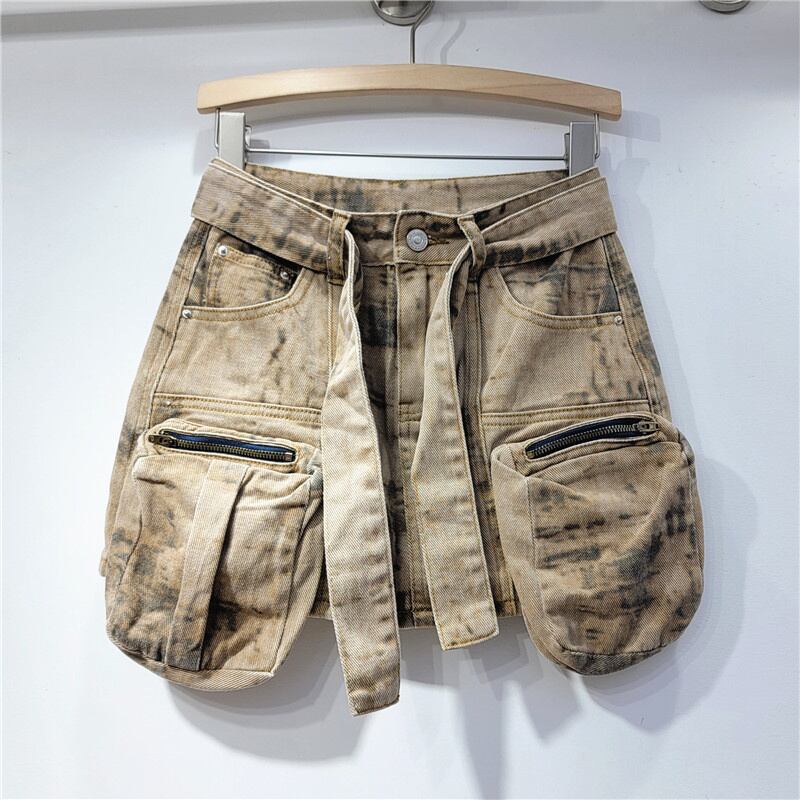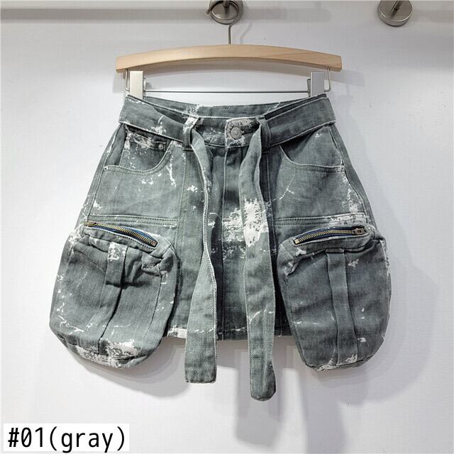 [EWQ] アメリカ大きポケットデニムスカートストリート不規則パッチワーク迷彩ミニスカート夏ホット服 サマー 夏物