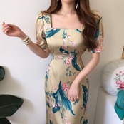 [EWQ] パーティードレススクエアネックカラフルプリントバブルスリーブドレス夏潮レースアップ Vestidos サマー 夏物 スクウェア