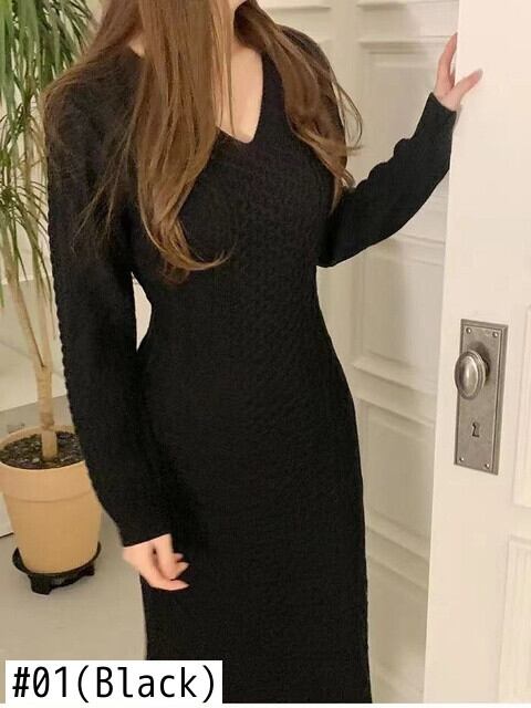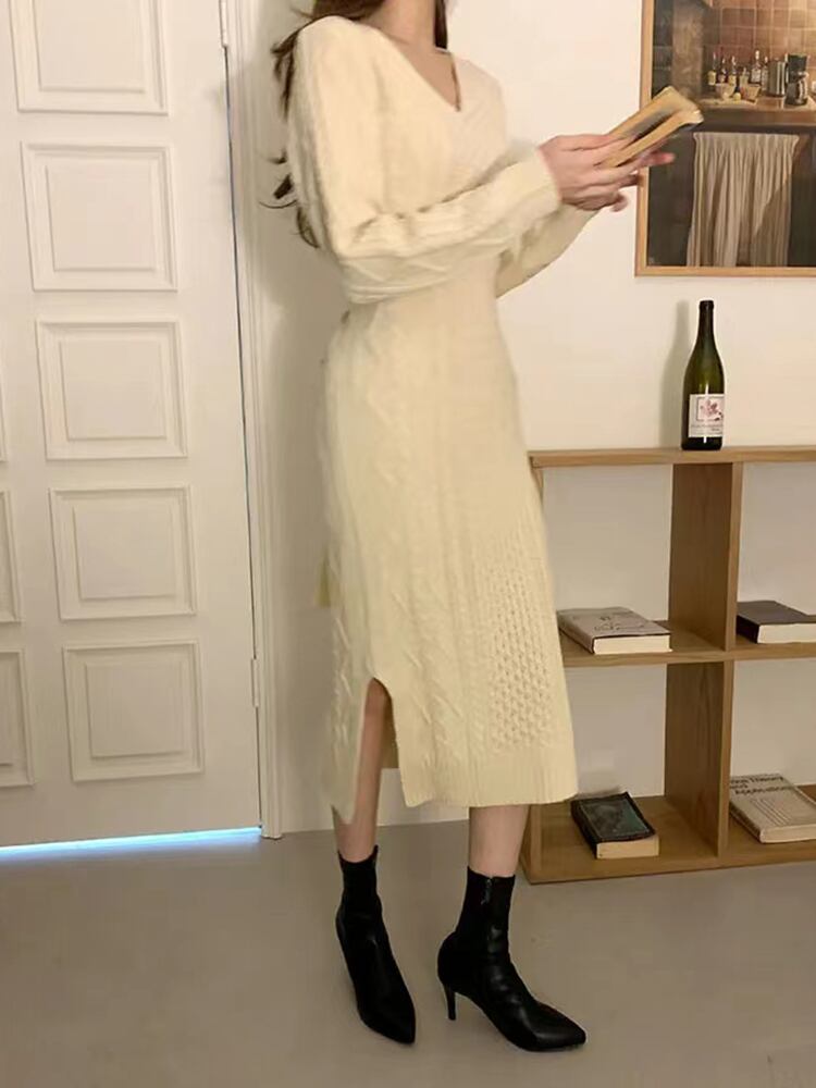 [EWQ] フックフラワー V ネックニットドレス長袖サイドスプリットスリムセータードレス秋潮 Vestido ロング オータム 秋物 Vネック フラワーデザイン