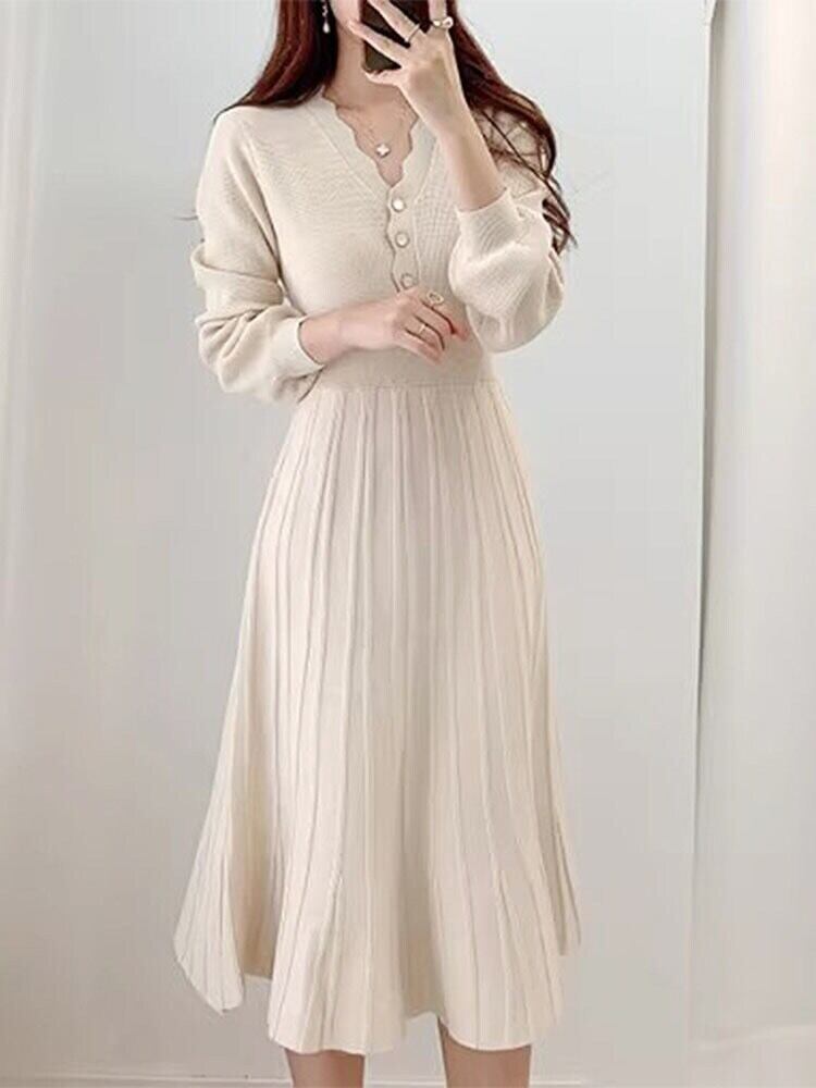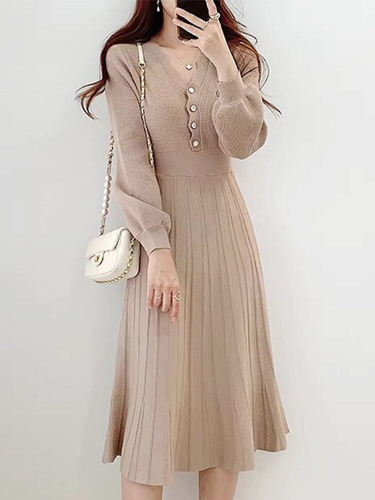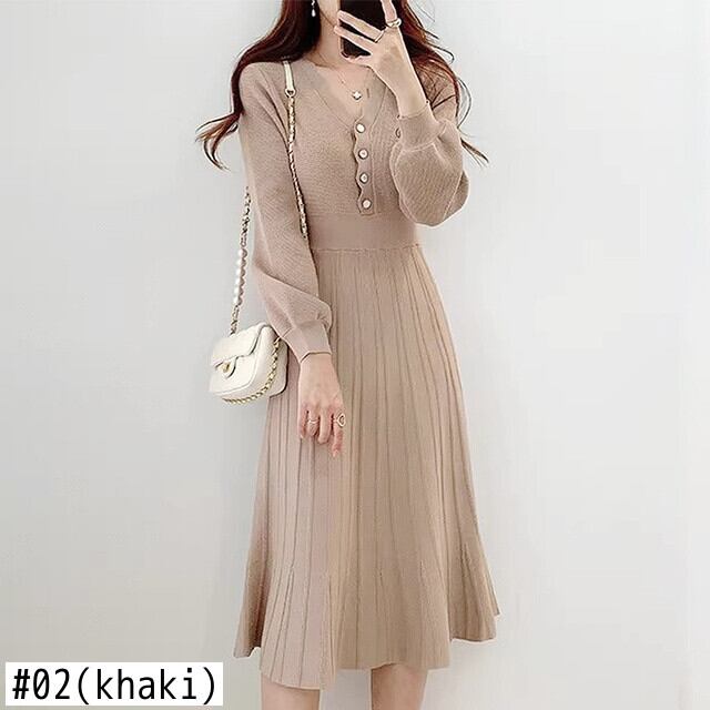 [EWQ] V ネックシングルブレストスプライス甘いニットドレス秋裾プリーツニットドレス 大人ガーリー スウィート キュート カジュアル オータム 秋物 Vネック