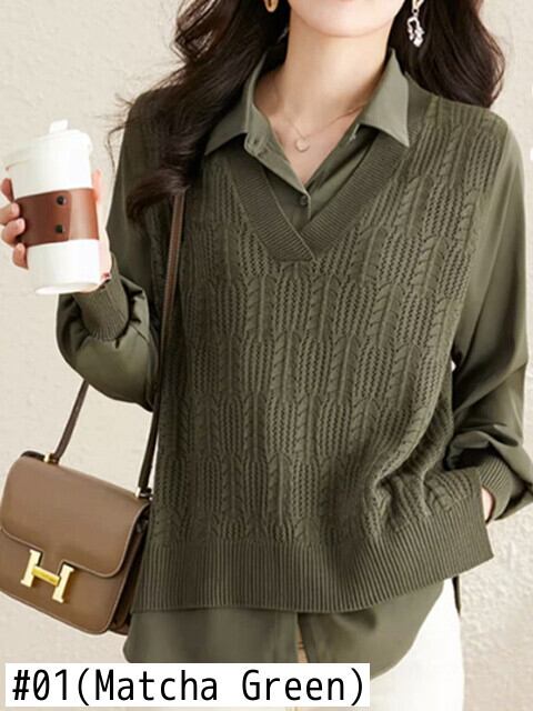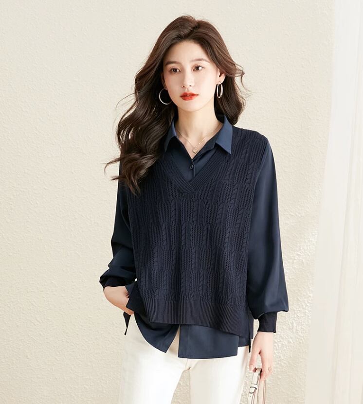 [EWQ] フェイクツーピースパッチワークニットシャツ長袖ビッグサイズルーズセーター秋潮トップ U3169 ロング オータム 秋物