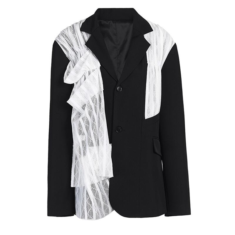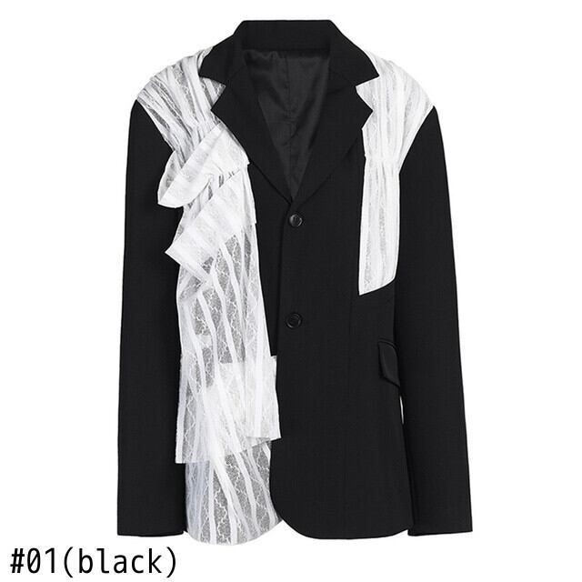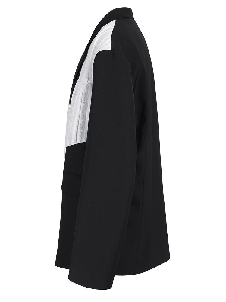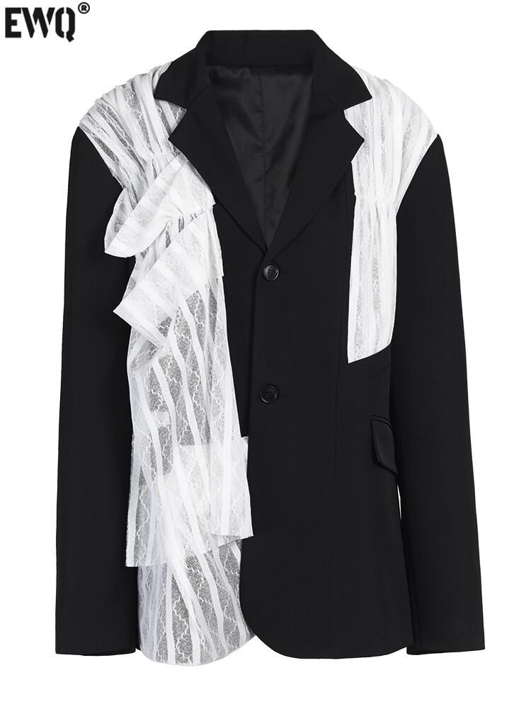 [EWQ] ブラックレースプリーツビッグサイズオフィスレディブレザー長袖スーツジャケットルーズトップス秋 CP0424 ロング オータム 秋物 会社 学校 通勤や通学にも