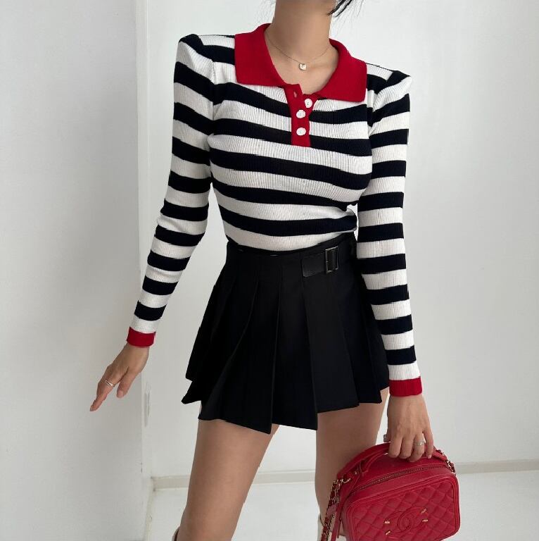 [EWQ] レトロストライプカラーコントラストラペル長袖ニットプルオーバー秋スリムニットトップス ロング オータム 秋物