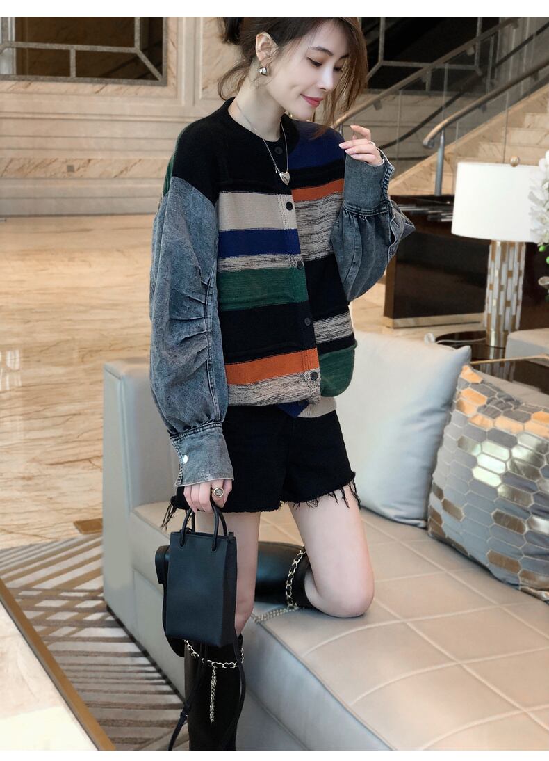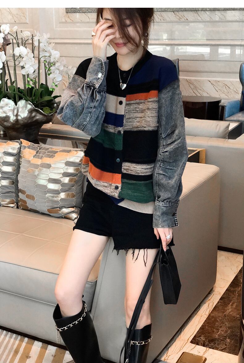 [EWQ] 長袖 デミン パッチワーク ニット ジャケット アウター Oネック ストライプ コントラスト ショートコート 冬 秋 ロング オータム 秋物 ウィンター 冬物
