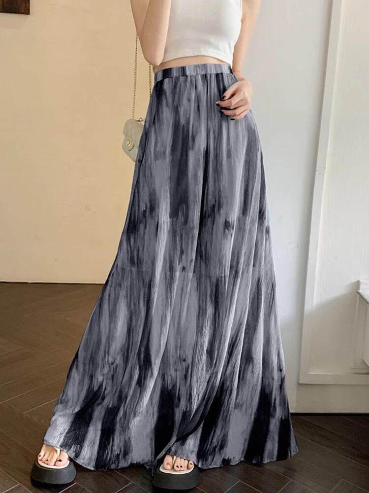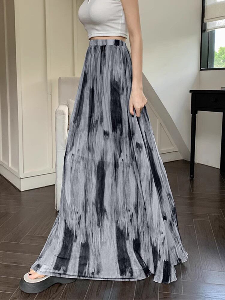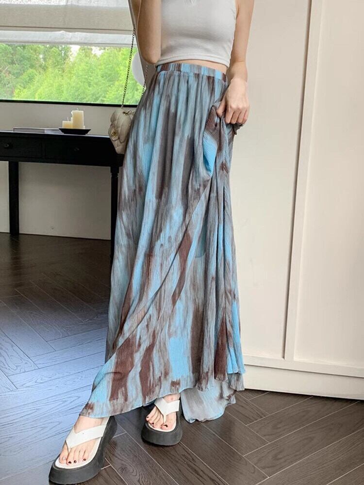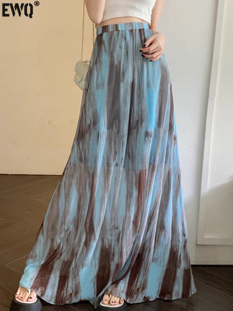 [EWQ] シフォンプリーツスカートウエストコントラストプリントスカート秋ルーズファルダオールマッチ服 オータム 秋物