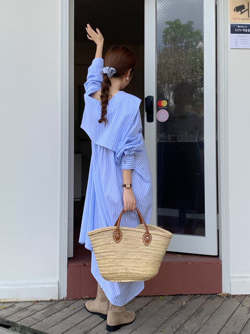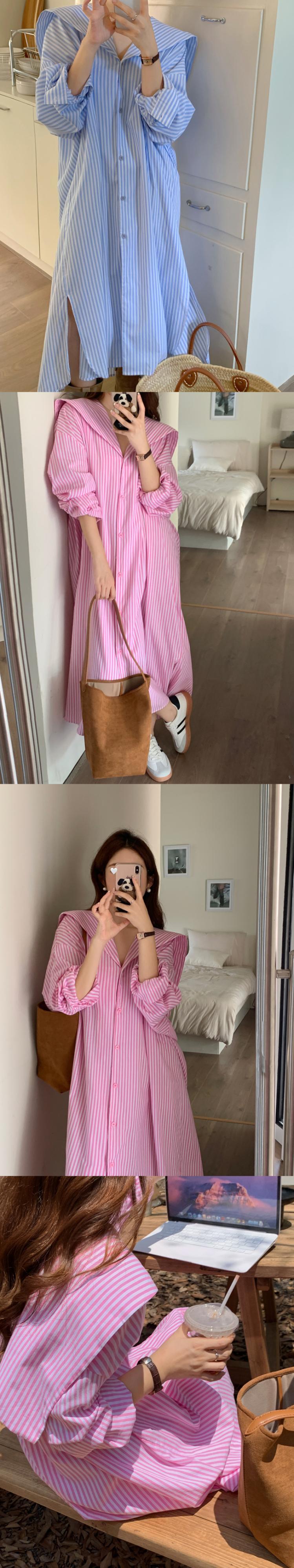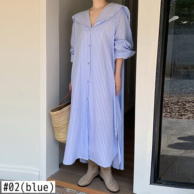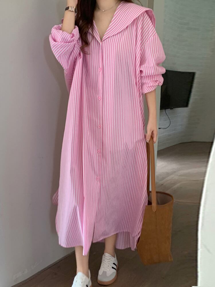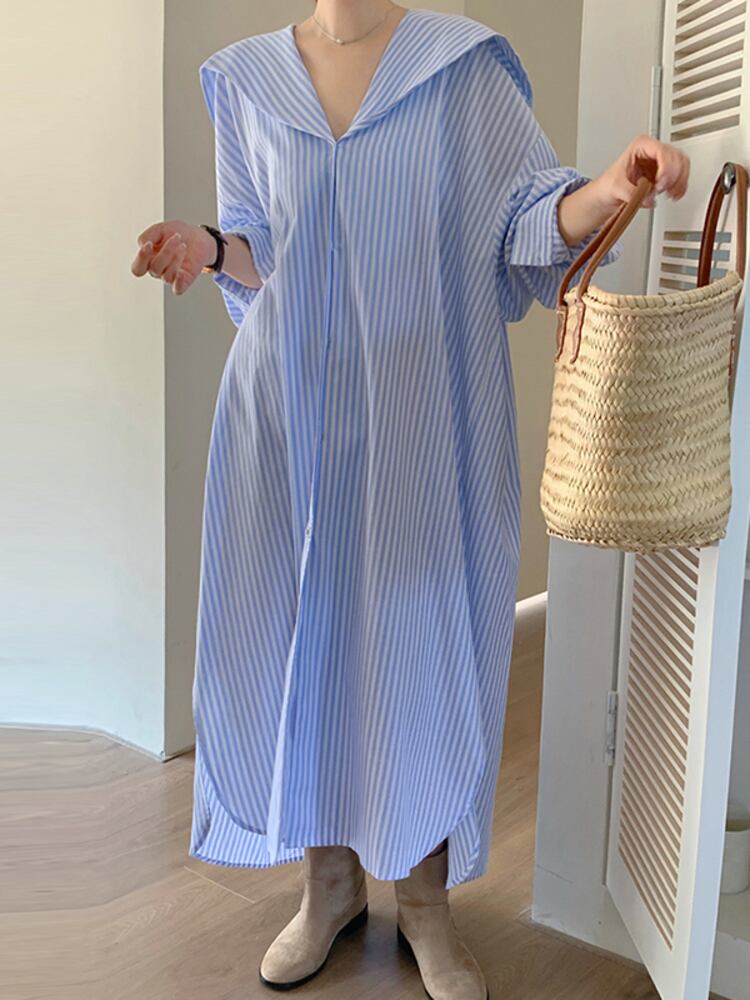 [EWQ] セーラー襟ストライプシャツドレス長袖ルーズシングルブレストドレス秋潮 Vestido ロング オータム 秋物
