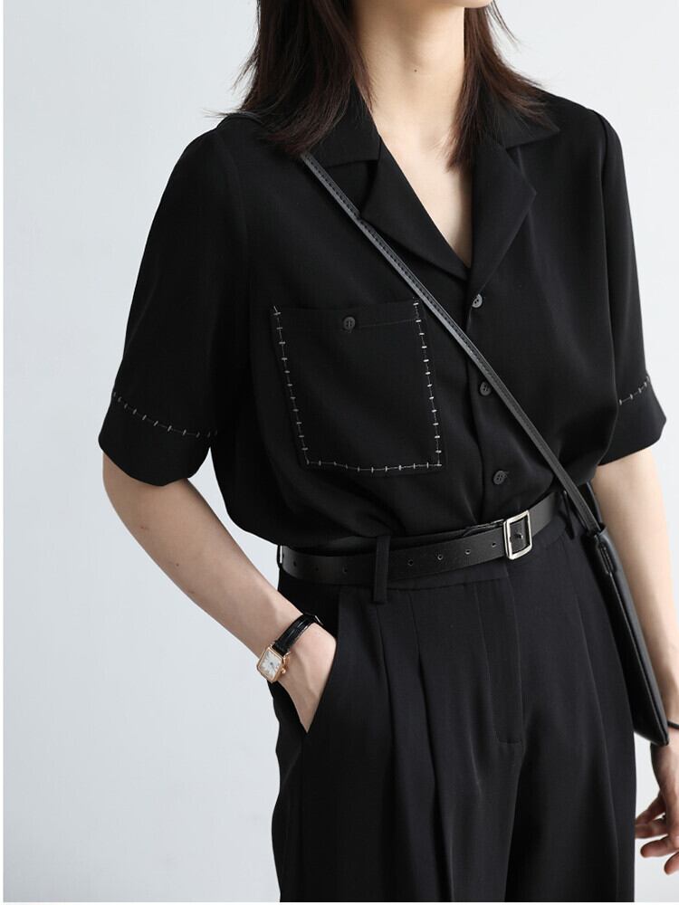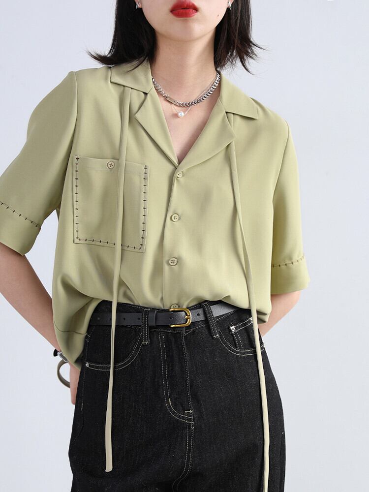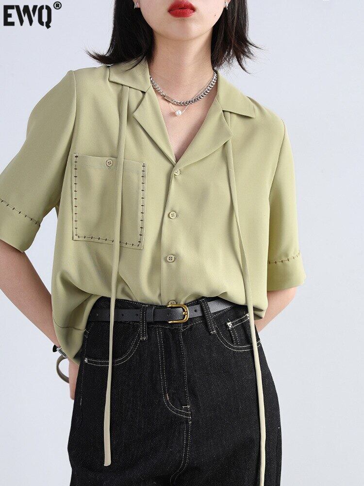 [EWQ] ポケットパッチワークノッチシャツ半袖レースアップルーズブラウス夏美しいトップス ショート ハーフスリーブ サマー 夏物