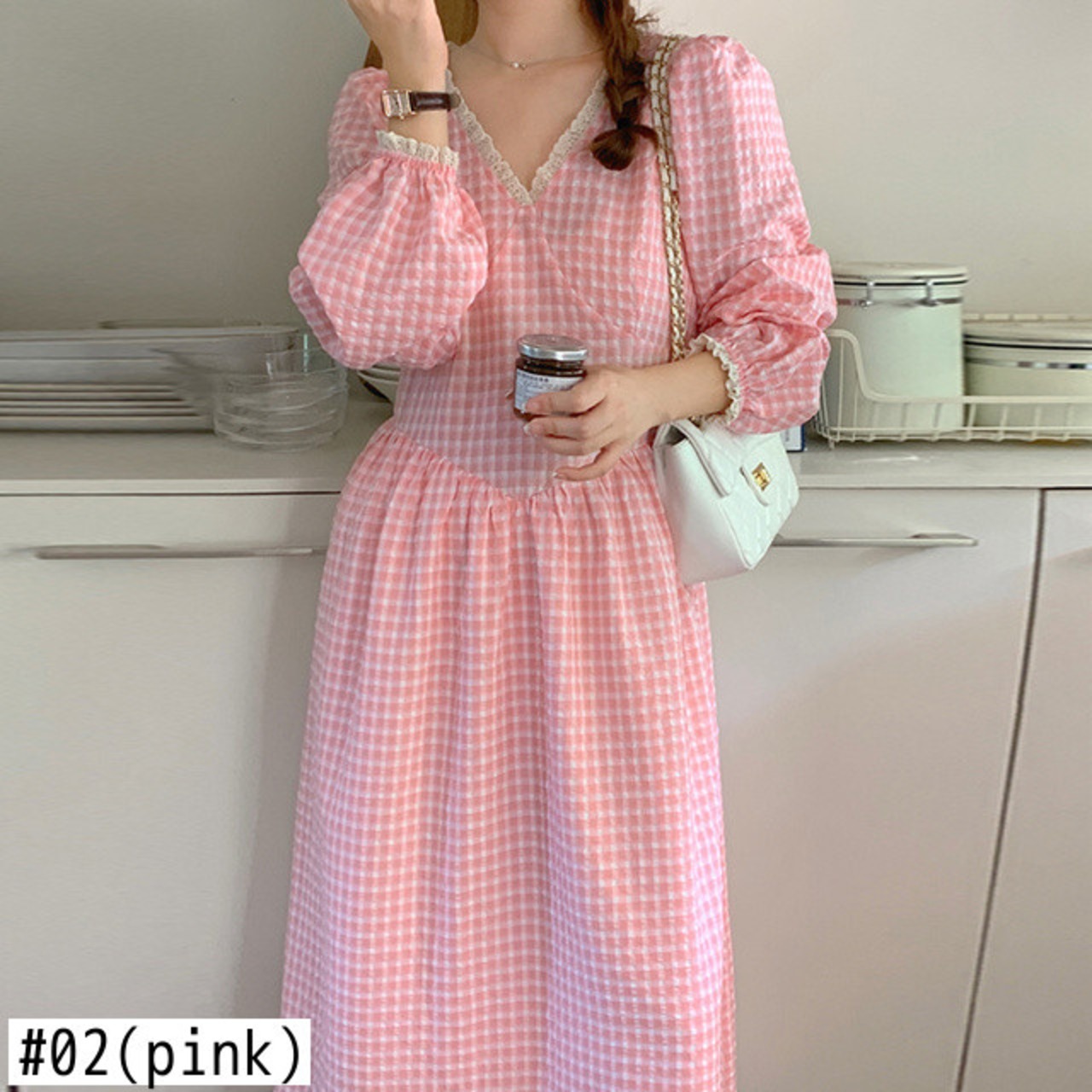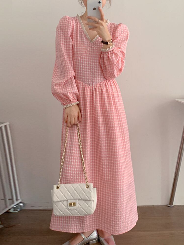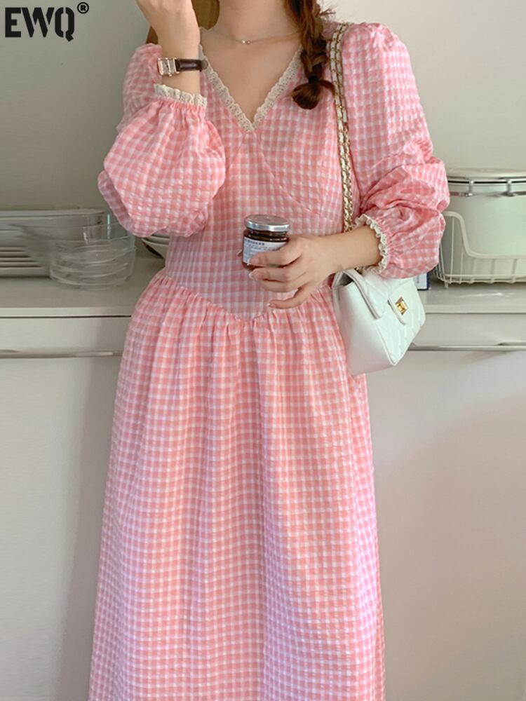 [EWQ] 甘い V ネックコントラストパッチワークドレス秋ランタンスリーブチェック柄ドレス潮 Vestido U2511 大人ガーリー スウィート キュート カジュアル オータム 秋物 Vネック