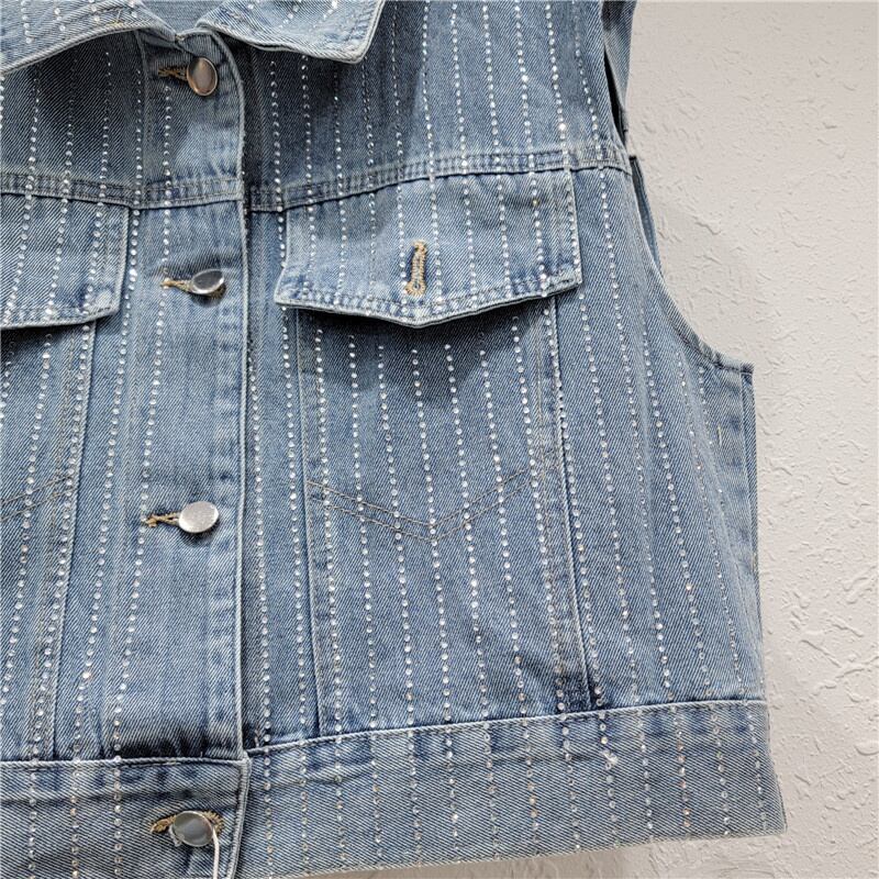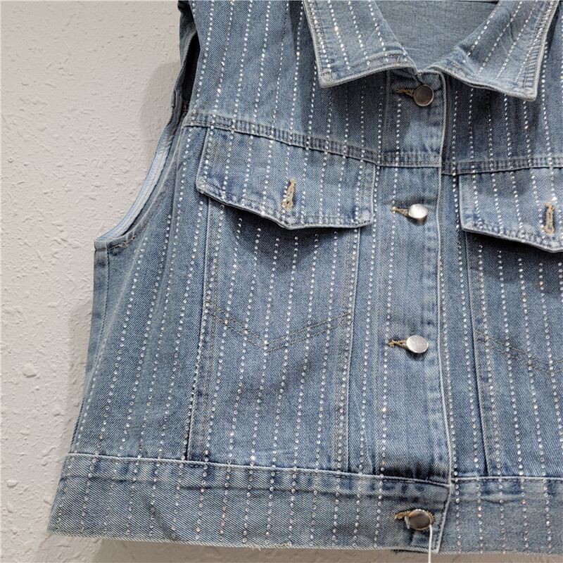 [EWQ] ストライプダイヤモンド装飾デニムベストパッチワークシングルブレストノースリーブジャケット夏潮トップ U3226 サマー 夏物