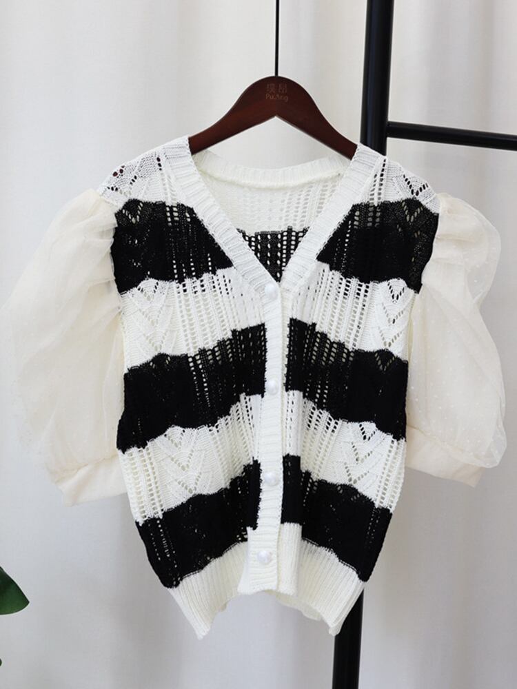 [EWQ] フックフラワー中空秋薄いカーディガンコート甘い半袖パッチワークストライプセータージャケット U1231 ショート ハーフスリーブ 大人ガーリー スウィート キュート カジュアル オータム 秋物 フラワーデザイン