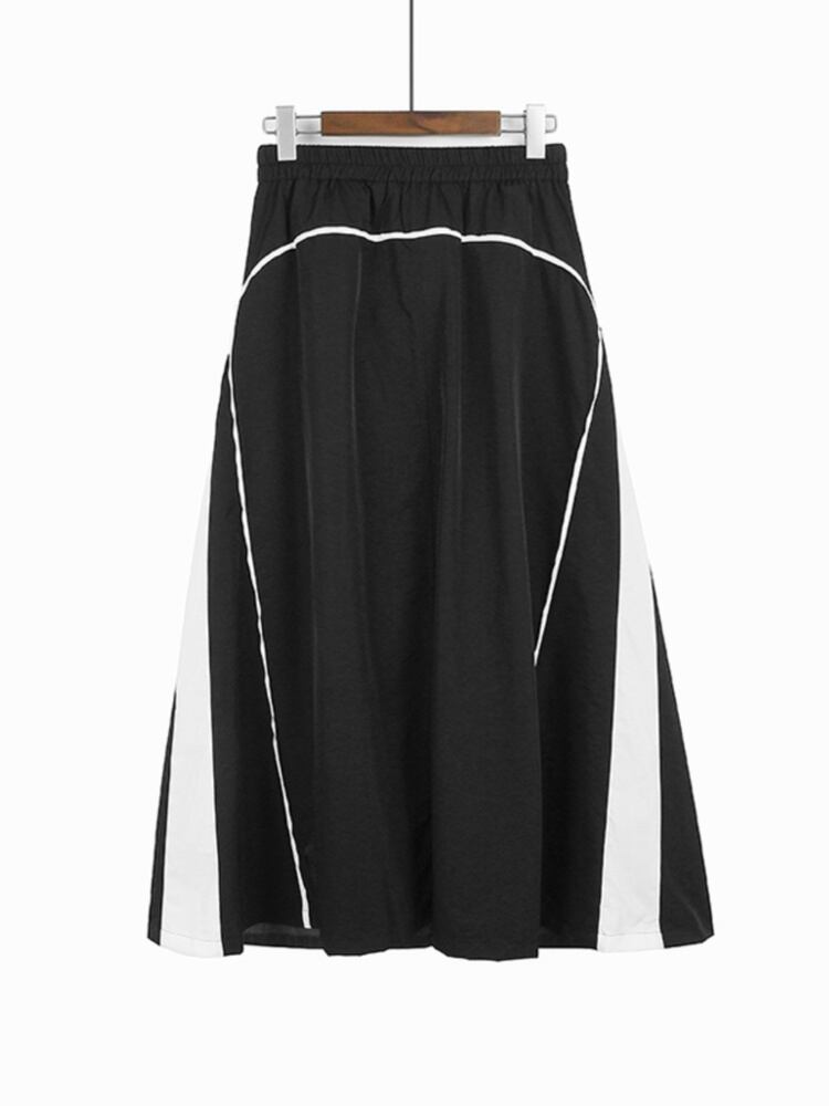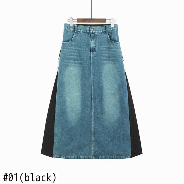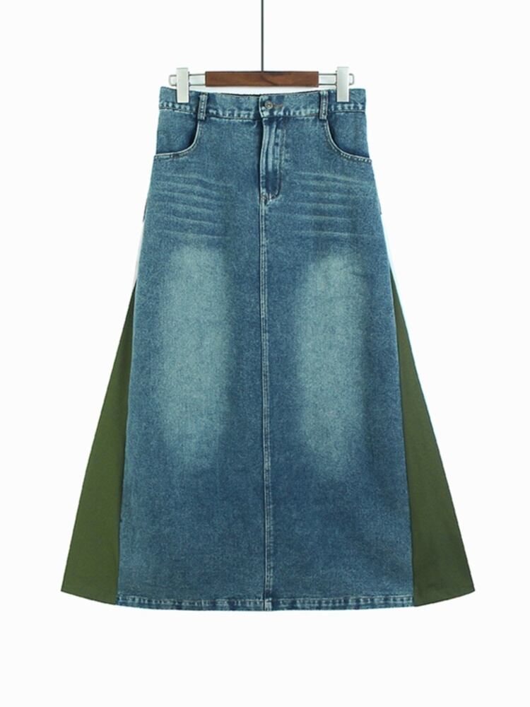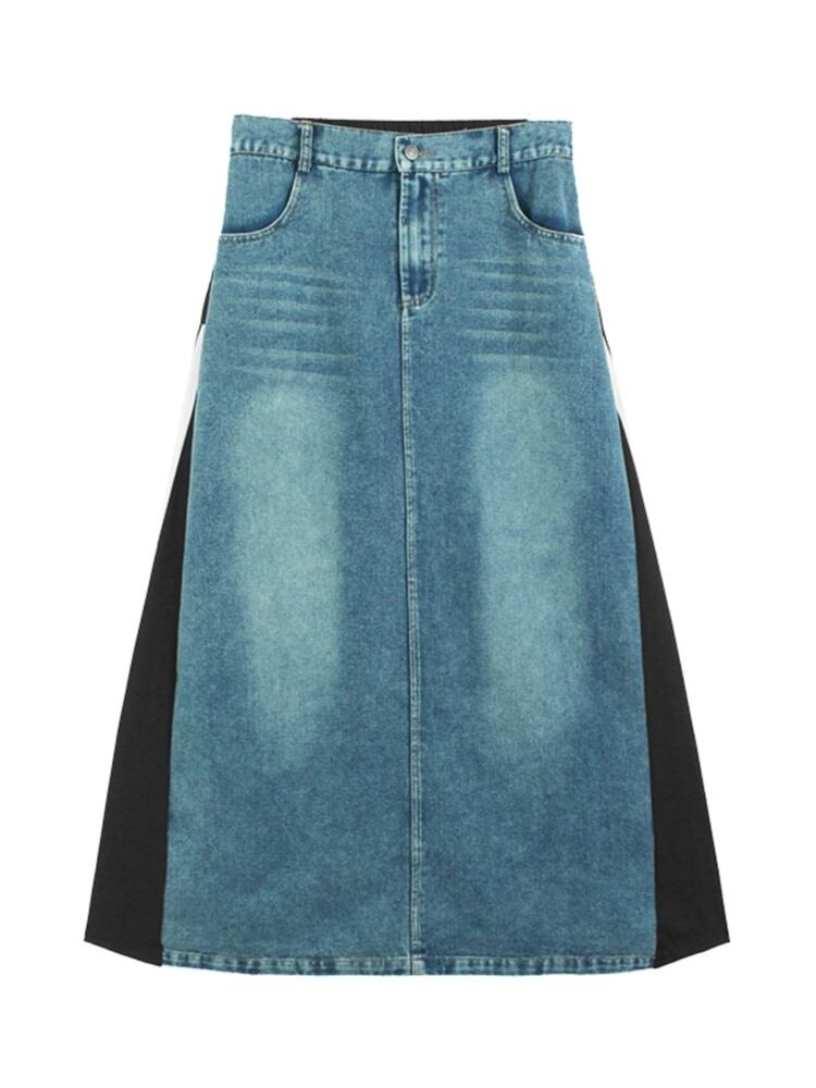 [EWQ] コントラストパッチワークデニムスカートレディースウエストスリムポケットミッドカーフスカート秋潮ファルダス オータム 秋物